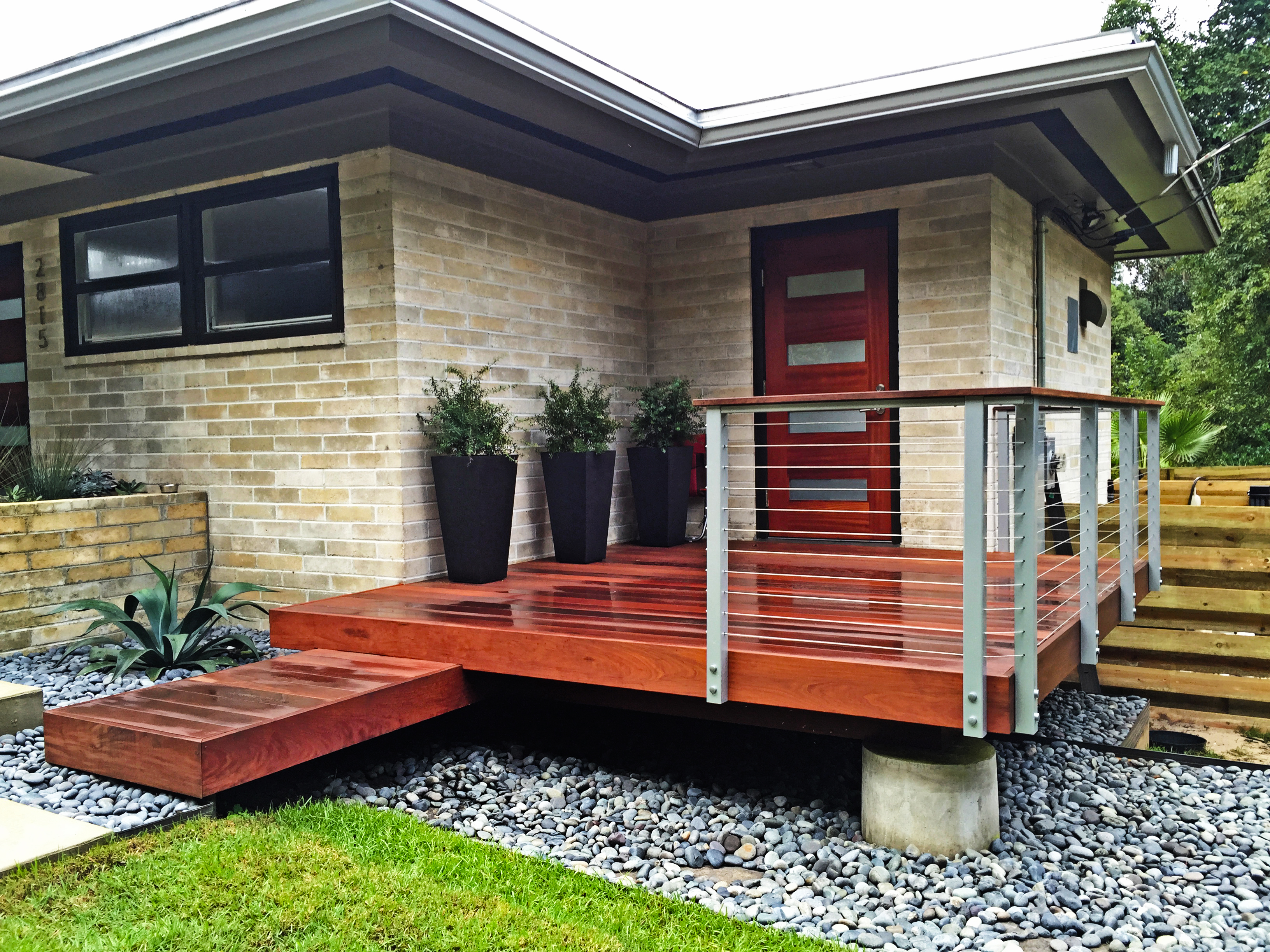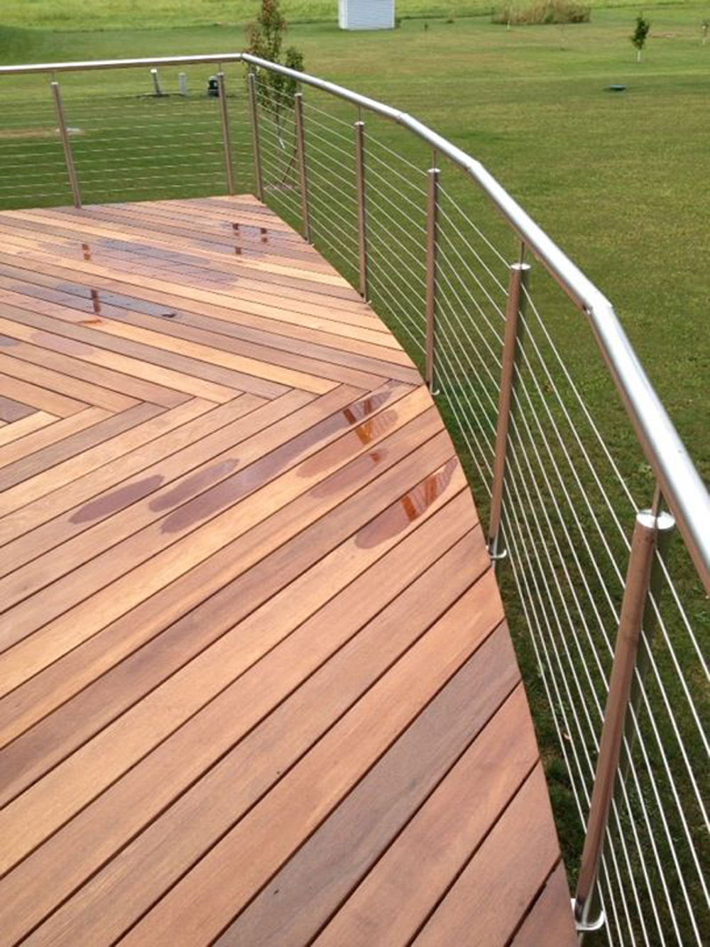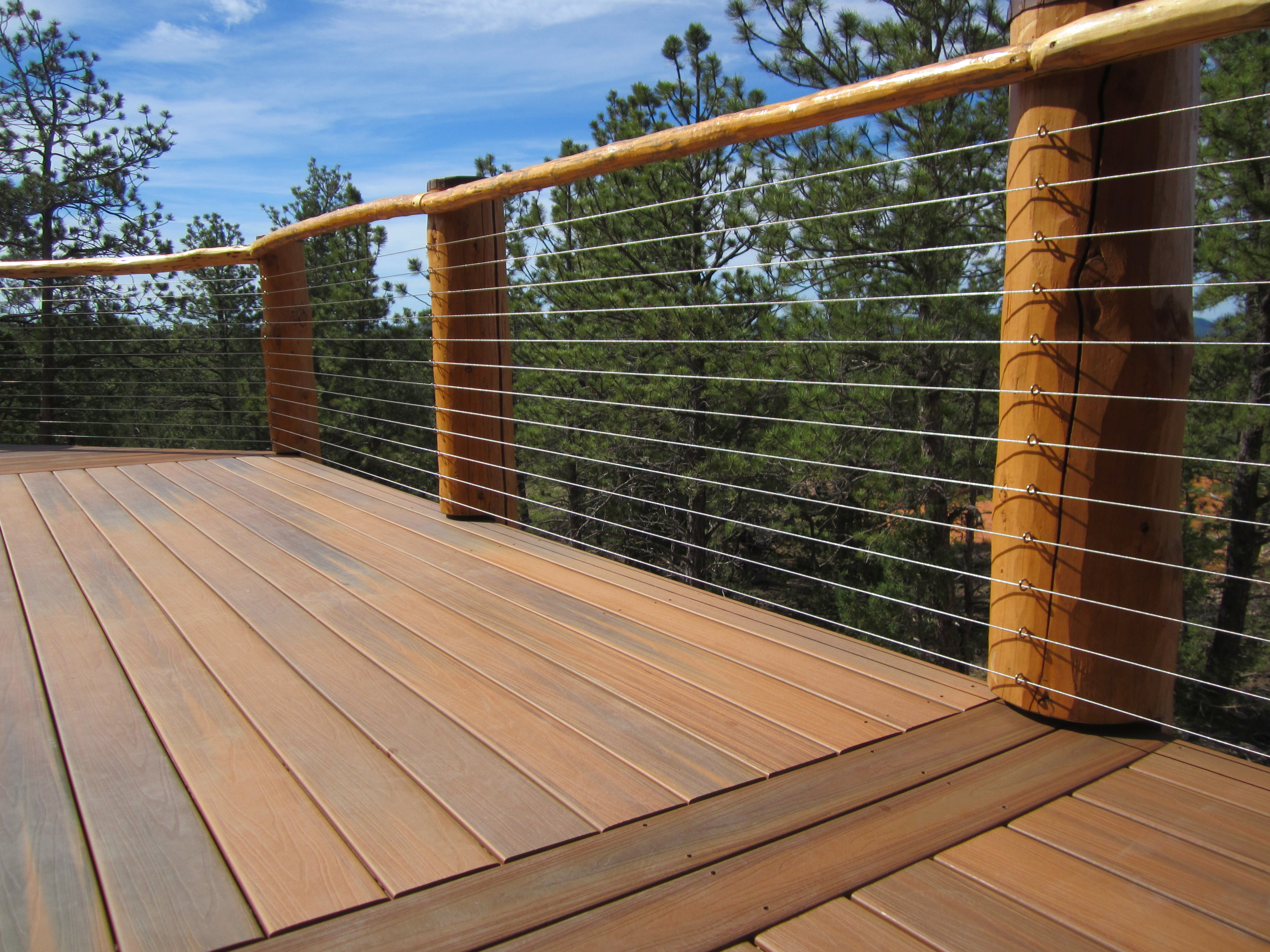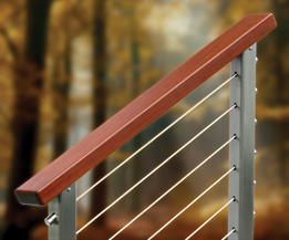 We currently offer four wood species for posts and/or top rails. Our Ipe Brazillian Walnut Top Rails are responsibly harvested from the rainforests of Brazil, promoting sustainable practices while providing you with this lovely, durable railing option. Enjoy the richness of Ipe's deep red color and knot-less grain, while adding an exotic twist to your property. Our exclusive line of Balau Mahogany top rails and posts offer similar strength and a comparable color, but stand apart due to their engineered strength. This wood is responsibly harvest by our suppliers in Asia and the Pacific, who pick only the finest specimens of superior species. The wood is then kiln dried and uniquely engineered for additional strength and resistance to checking and splitting, resulting in an exceptionally durable, and consistently beautiful, end product. We also carry Western Red Cedar, a construction classic for thousands of years here in North America due to its natural resistance to moisture, insects, and general wear. This sturdy, durable wood option offers a lighter color than Ipe and Batu, and is available as clear (knot-free) top rail or tight-knot posts. The posts we carry are called Quattro™Posts, which are harvested in Canada and engineered by SynergyPacific to be even stronger and more builder-friendly than they already naturally are. The newest addition to our wood catalog is Alaskan Yellow Cedar. Combining delicate coloration and incredibly fine grain with an unexpected high density, this wood is as structurally strong as it is visibly fair. In addition to common constructions such as bridges, boats, and decks, Alaskan Yellow Cedar is also often used for specialty constructions, such as temples and shrines. This unique wood species provides the perfect accent for a striking cable railing. Our railings are highly configurable. Mix wood varieties or combine a wood top rail with one of our metal posts: ALUMINUM, ROUND STAINLESS STEEL, or SQUARE STAINLESS STEEL. Consult our Wood Installation Instructions and Special Terms for Wood Orders for more information on wood products and applications.