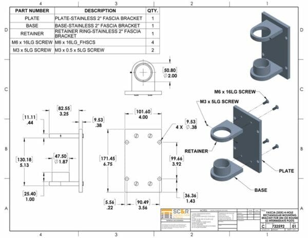 Stainless Steel Rectangular Fascia Bracket 4 Hole Design for 2in OD Round Posts.