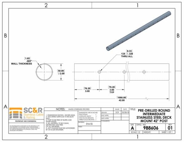 - Dimensions: 2in OD with 1.6mm wall thickness. For Cable Railing Systems at 42in Rail Height
