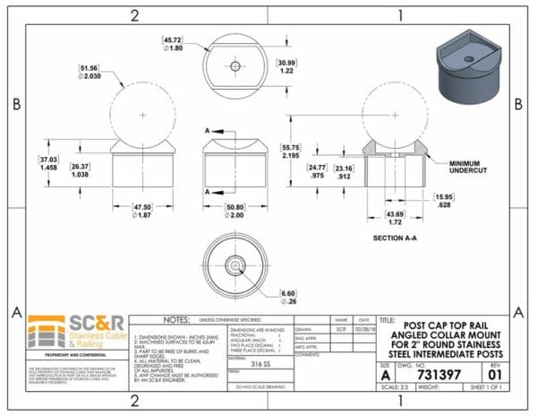 Post Cap Top Rail Angled Collar Mount for 2″ Round Stainless Steel Intermediate Posts