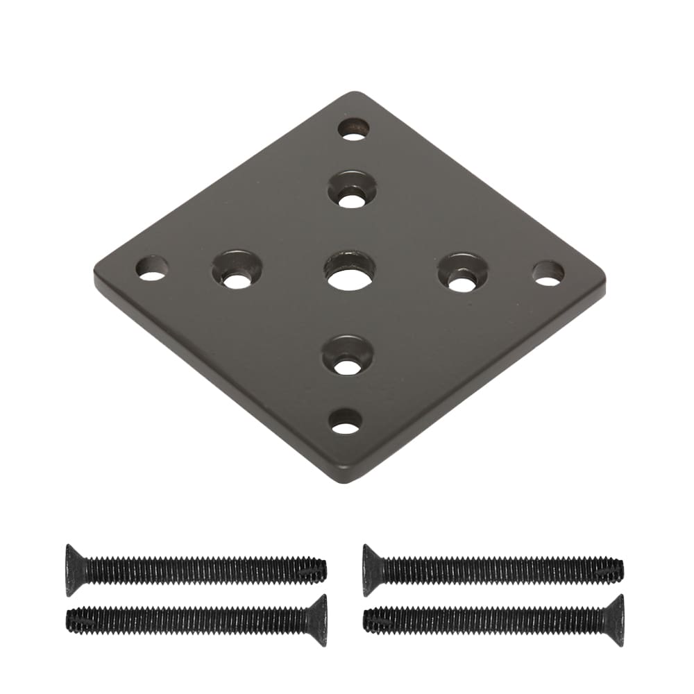 This base plate assembly attaches our Aluminum Posts to a 2×6 Wood Top Rail. Mounts directly to the top of any of our aluminum posts. Use #14 x 1.25″ Phillips Pan Head Screws to attach plate to wood top rail.