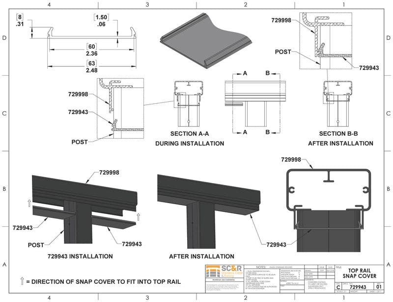 TOP RAIL SNAP COVER snaps into the underside groove of SHAPED OR RECTANGULAR TOP RAIL.