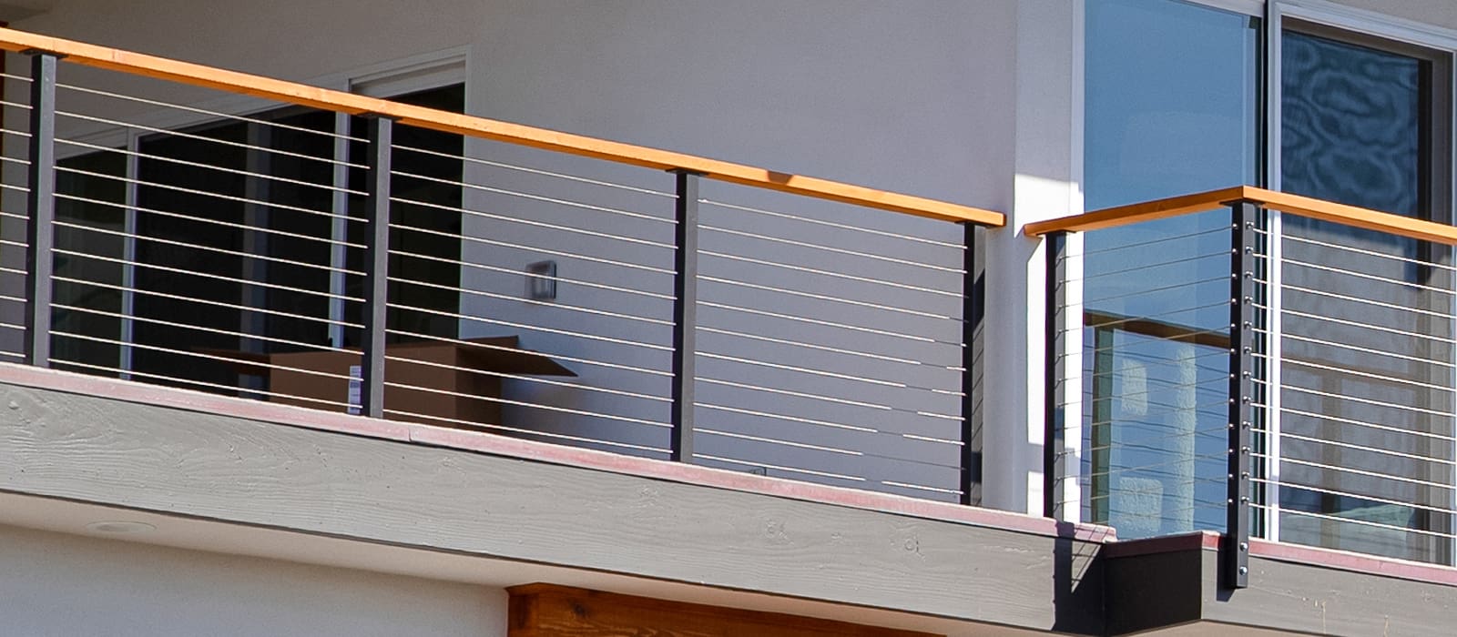 Cable railing systems with powder-coated aluminum frames and stainless steel hardware.