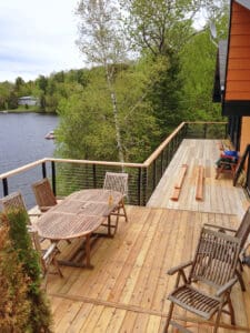 Home » Colors » Black » Page 4 Black Aluminum Cable Railing – Montreal, Quebec Dangling over a serene lake in Quebec, Canada, this deck required an open railing design for its remodel. The black aluminum posts and thin cable disappear against a view of trees and water, and contrast nicely with the fresh wood…