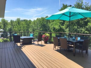 Home » Colors » Black » Page 4 Black Aluminum Cable Railing – Albany, NY This stylish deck in Albany, New York was built for entertainment. With multiple areas for lounging and socializing, the homeowners chose a fascia-mount railing that keeps the space open. The dark aluminum contrasts nicely with a light wood deck and…
