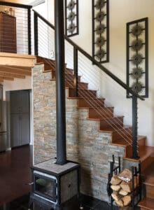 Home » Colors » Black » Page 4 Black Aluminum Cable Railing – Benedicta, ME This black aluminum railing provides stylish safety for the stair and loft area of this modern, rustic cabin. The dark color matches other black metal furnishings and stands out nicely against an earthy backdrop of stone and wood. Surface Mount…