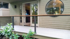 Home » Colors » Bronze Bronze Aluminum Cable Railing – Vancouver, WA With such a cozy living area overlooking the trees and water beyond, this homeowner opted to remove their deck, but still wanted to be able to open the sliding glass doors. The solution? A cable railing system in a woodsy color that all…