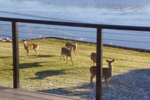 Home » Colors » Bronze Bronze Aluminum Cable Railing – Cary, IL In an area surrounded by beautiful scenery and wildlife, this homeowner installed cable railing, allowing them to embrace every bit of their view. The bronze color emulates the thin limbs of trees, providing a natural frame to a waterside scene of feasting deer.…