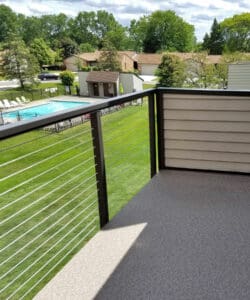 Home » Colors » Bronze Bronze Aluminum Cable Railing – Ortonville, MI Our bronze aluminum systems on multi-family buildings visually fit in perfectly with this little community in Ortonville, MI. The open design of our railing lets viewers overlook the pool and enjoy the tree line in the distance. Color & System Top Rail Mounting…