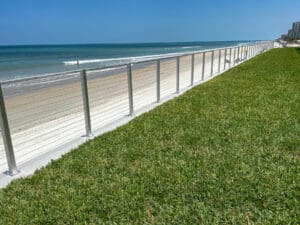 Home » Colors » Natural Anodized Clear Aluminum Cable Railing – Edgewater, FL Perched above the beach with a luscious green lawn, this multi-family housing complex needed an ocean-friendly railing solution that kept the view open and easy to enjoy. Our newly developed Anodized Aluminum products feature the same designs as our traditional aluminum line…
