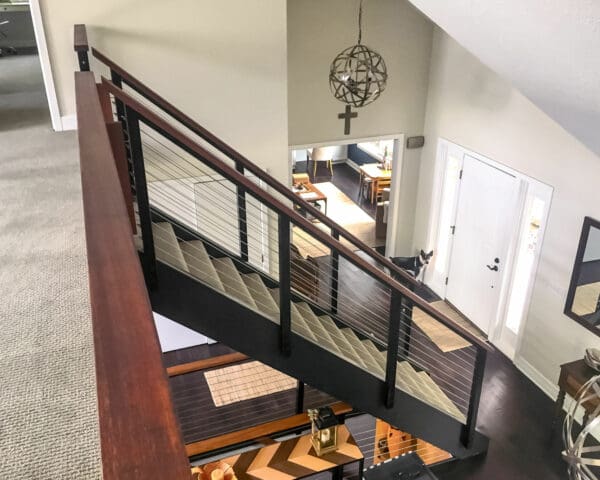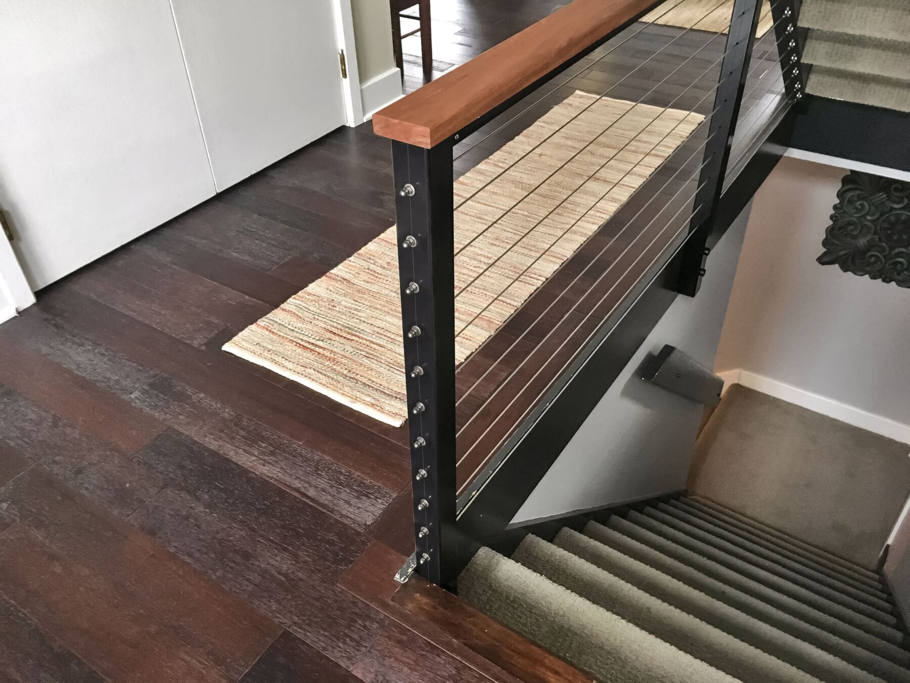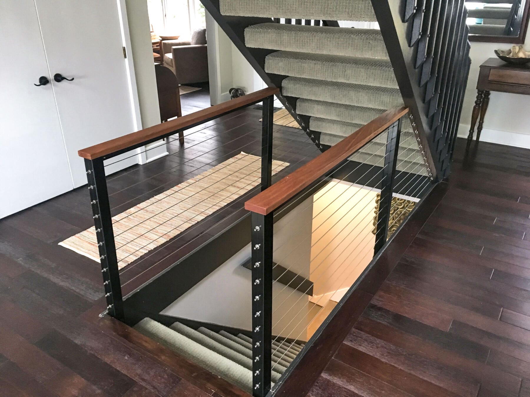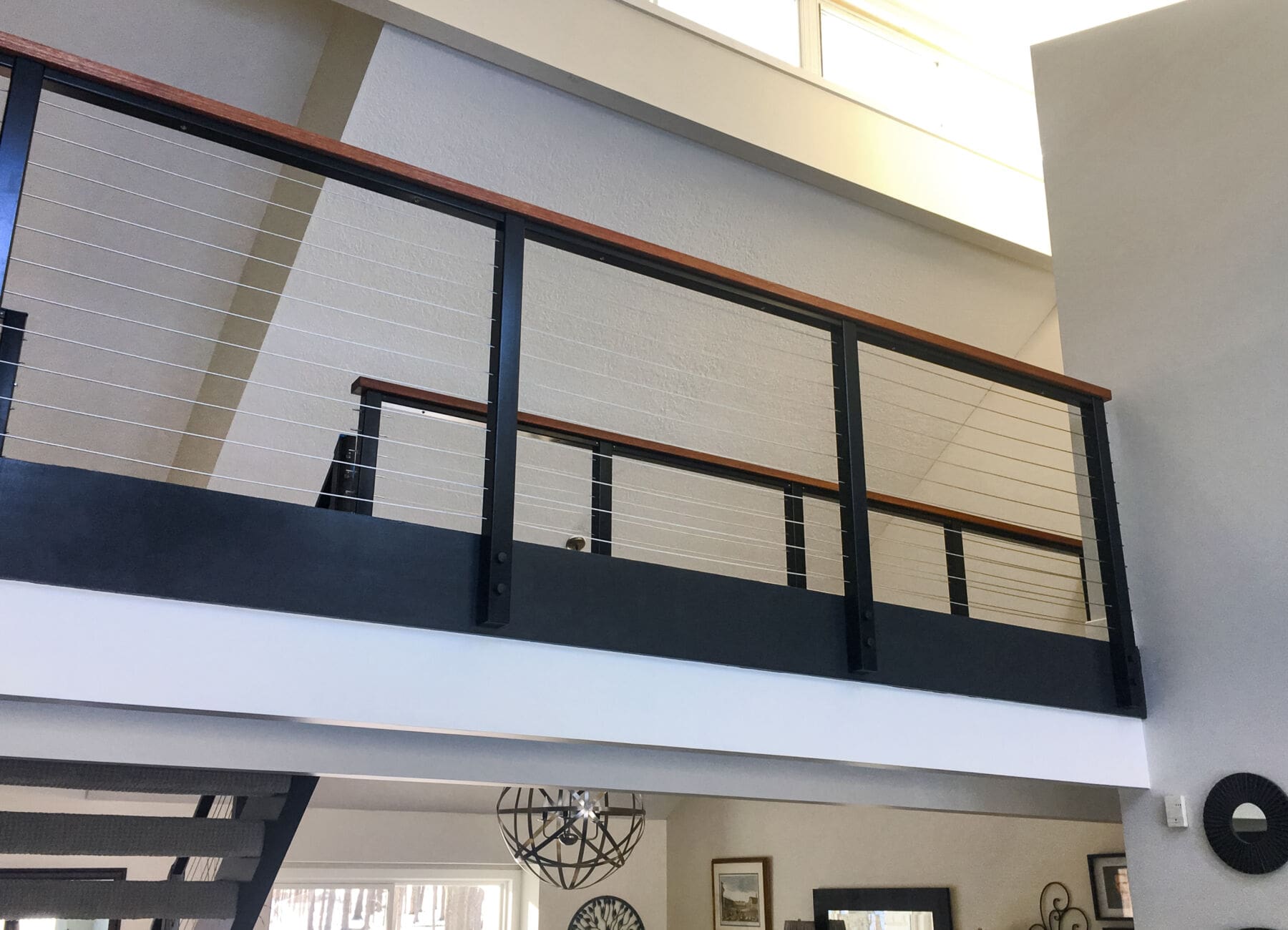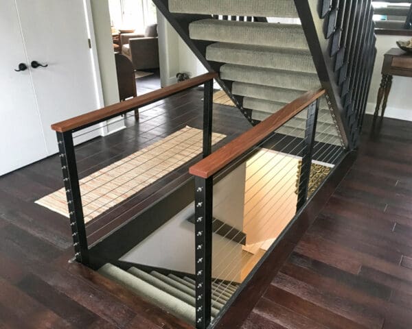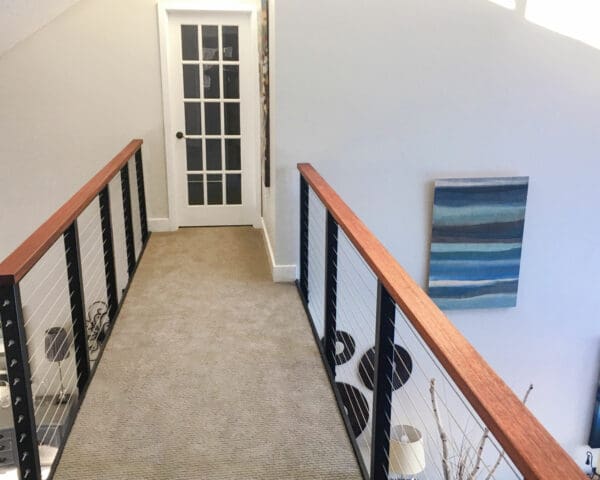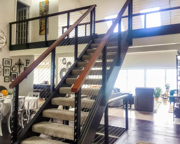 With two staircases stacked on top of each other in the middle of their living space, these homeowners used our cable railings to keep things safe, but open. The black aluminum and Balau frame is visually striking while being vastly less obstructive than the previous railing. For the lower staircase, these customers created a gap-less railing by using our surface mount toggle terminals to anchor the cable to the underside if the upper staircase.