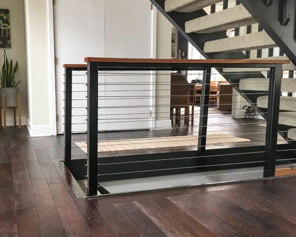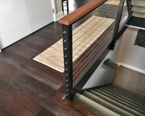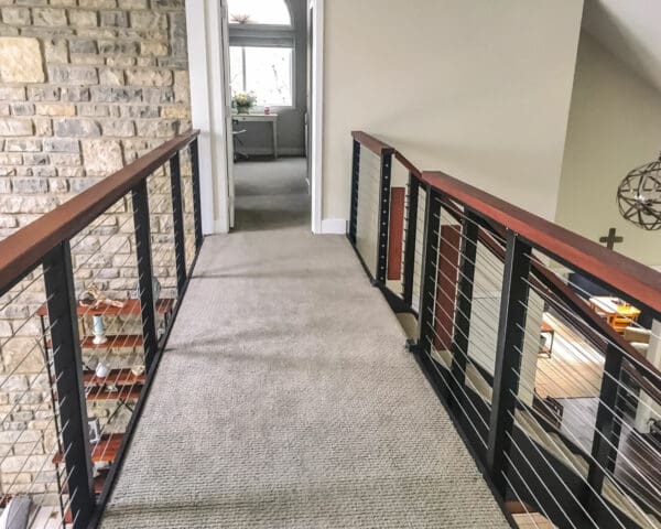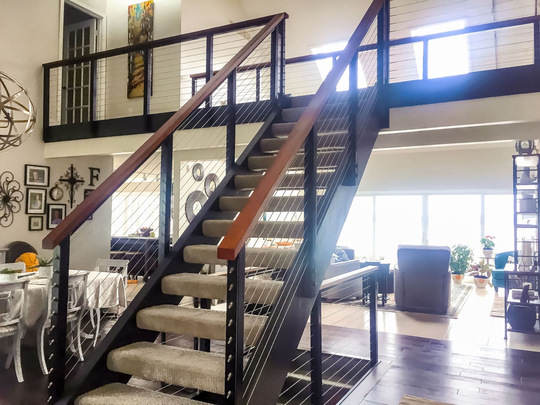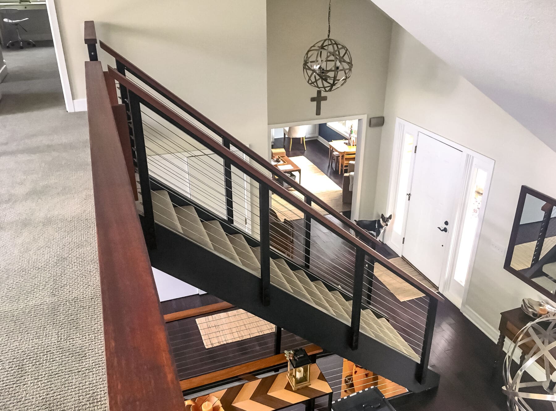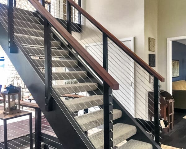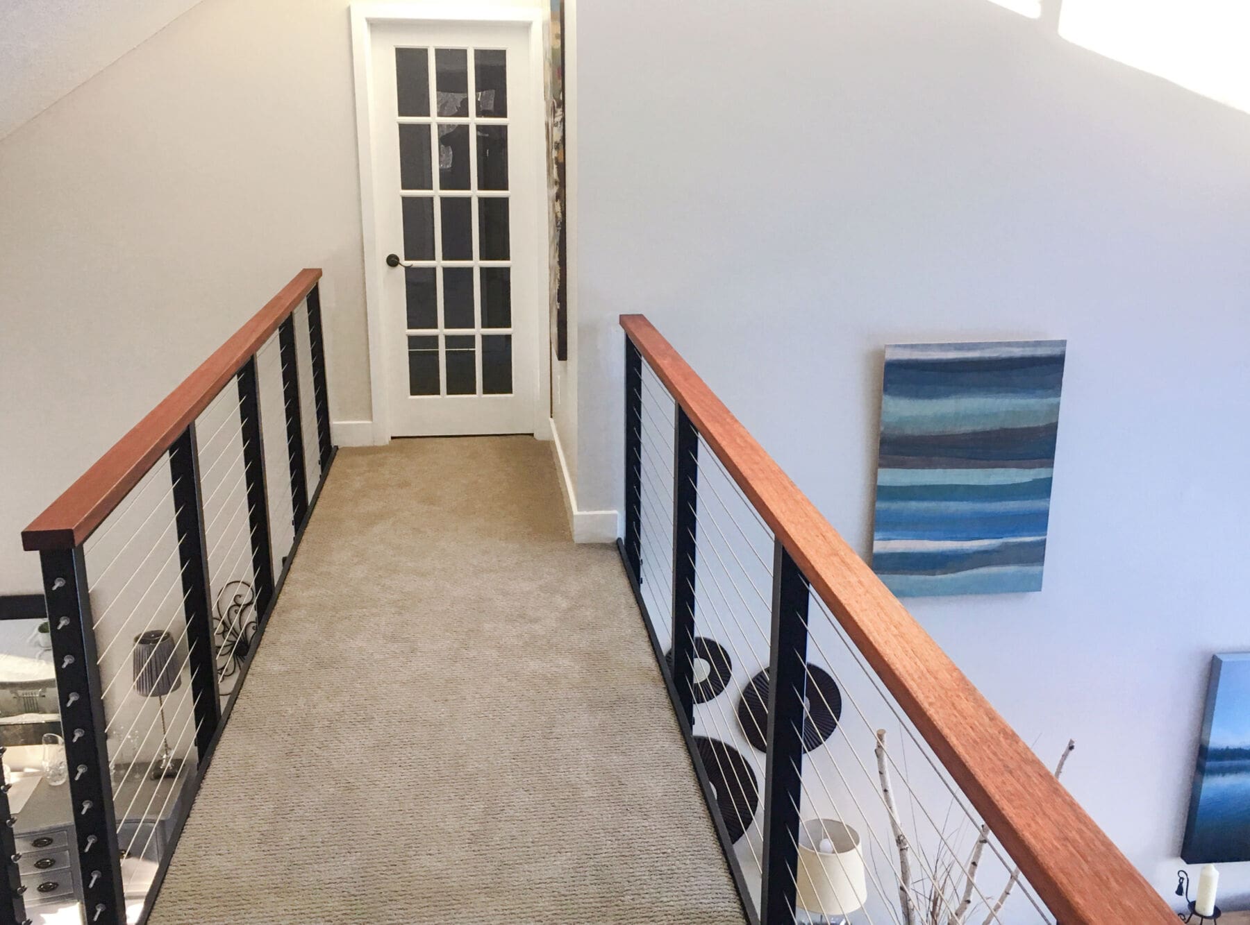 With two staircases stacked on top of each other in the middle of their living space, these homeowners used our cable railings to keep things safe, but open. The black aluminum and Balau frame is visually striking while being vastly less obstructive than the previous railing. For the lower staircase, these customers created a gap-less railing by using our surface mount toggle terminals to anchor the cable to the underside if the upper staircase.