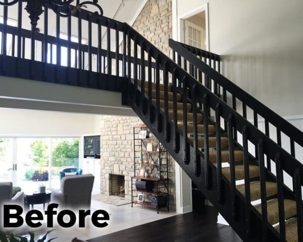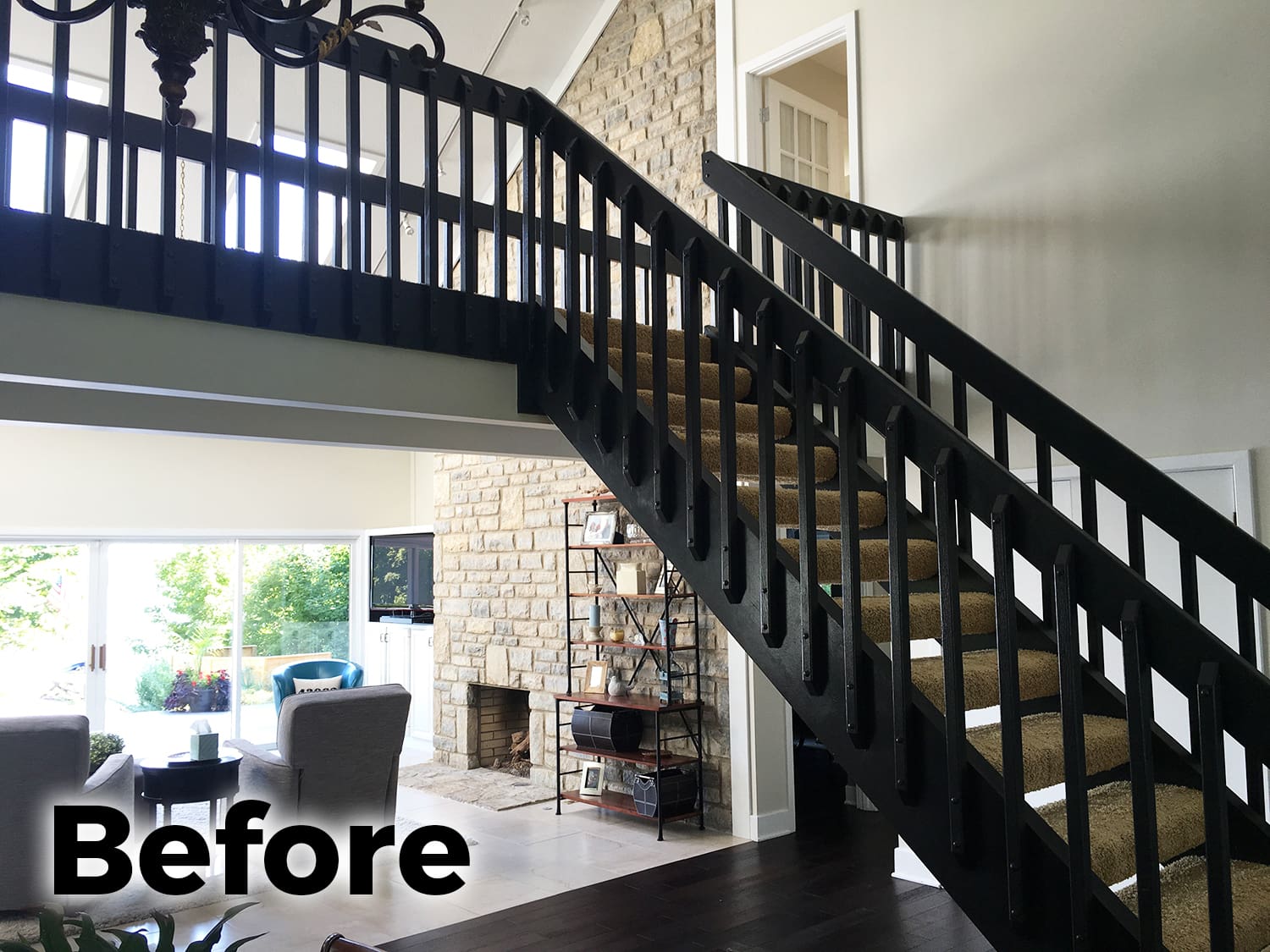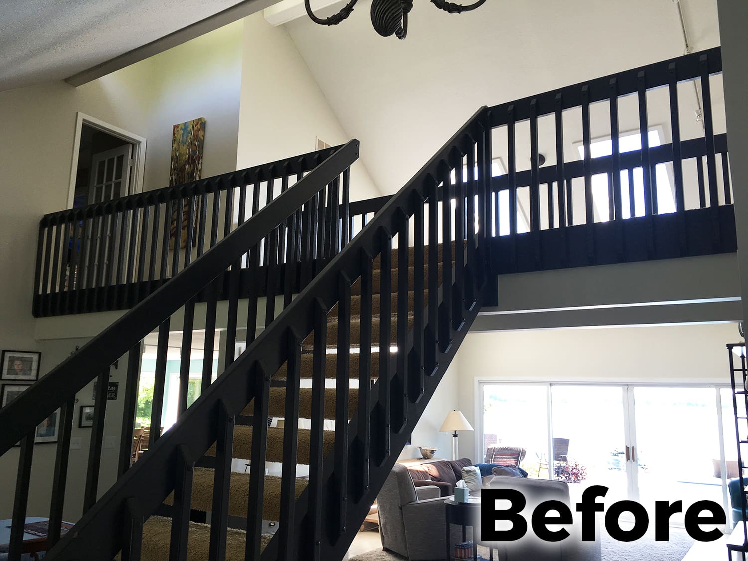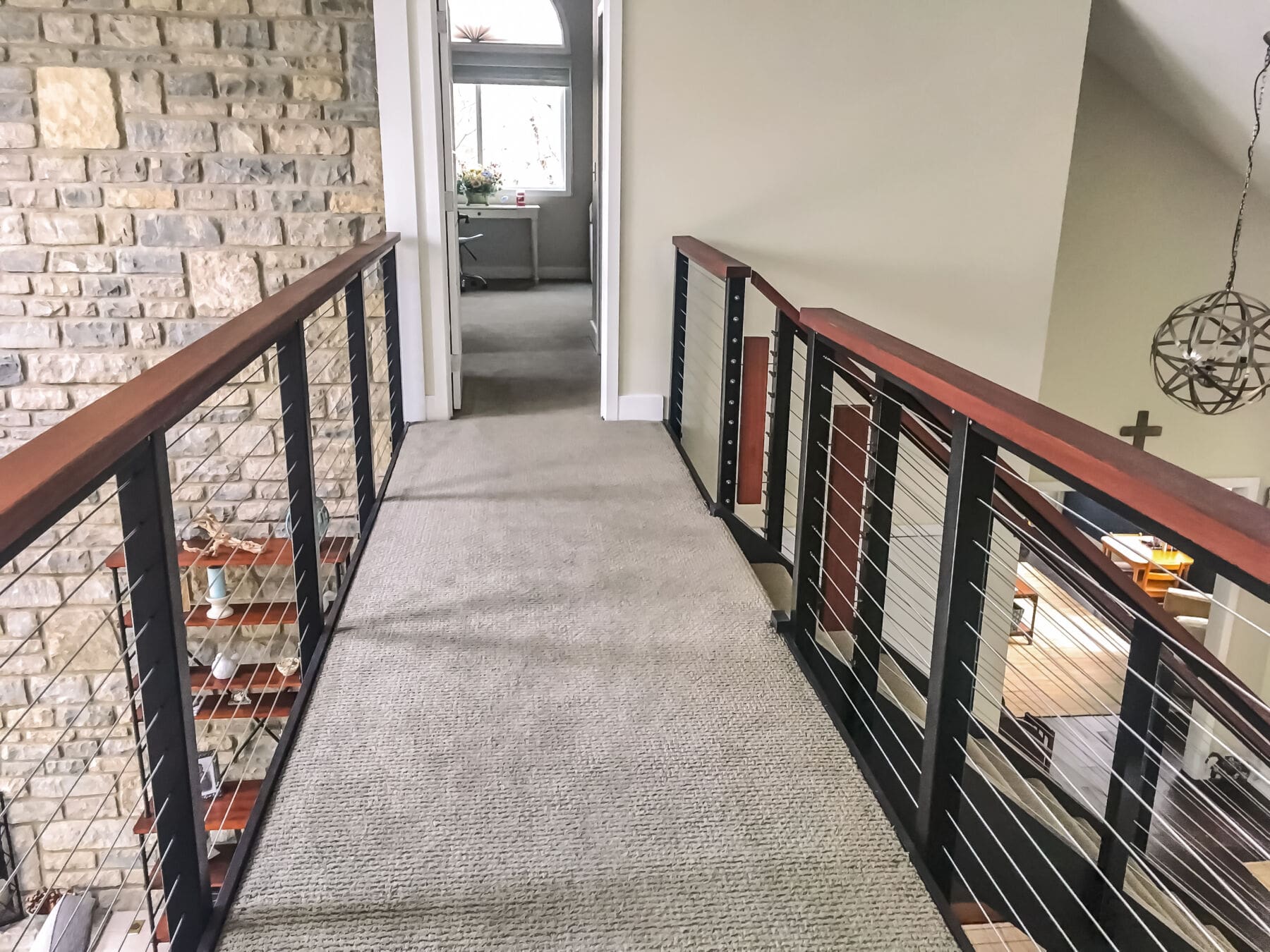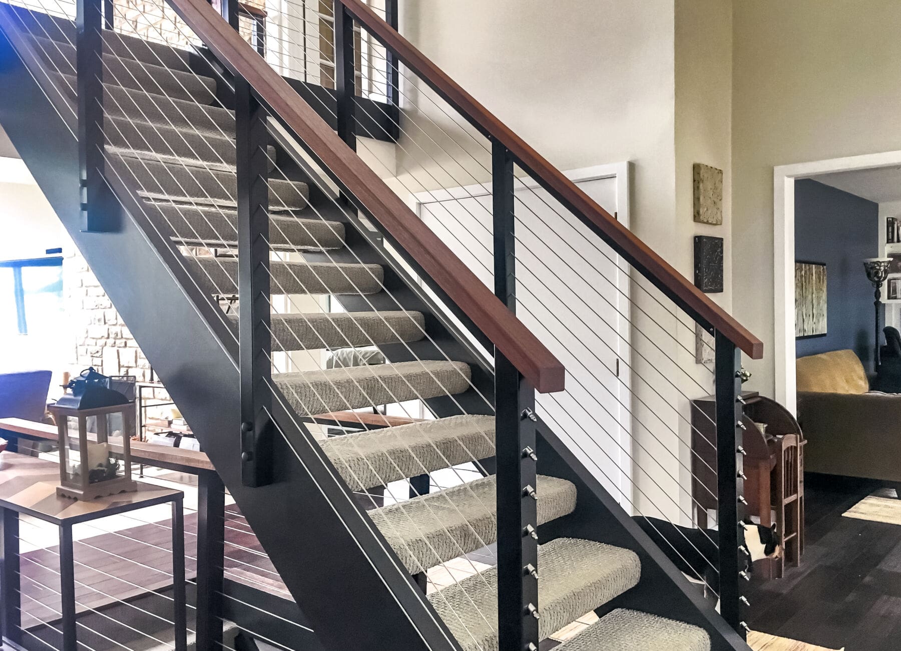 With two staircases stacked on top of each other in the middle of their living space, these homeowners used our cable railings to keep things safe, but open. The black aluminum and Balau frame is visually striking while being vastly less obstructive than the previous railing. For the lower staircase, these customers created a gap-less railing by using our surface mount toggle terminals to anchor the cable to the underside if the upper staircase.