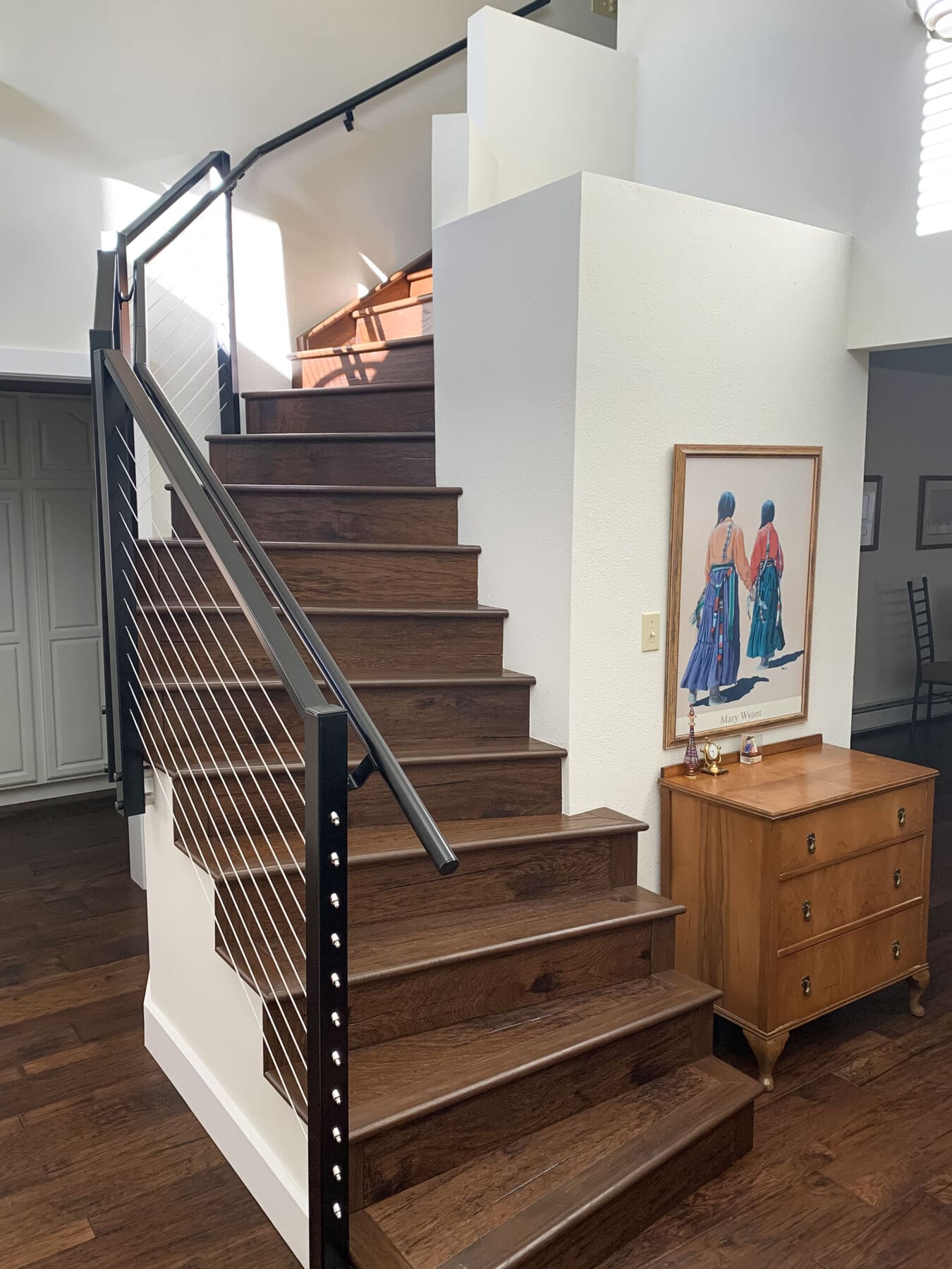 Cable railing and our Link Handrail effortlessly wrap this unique, curving staircase. Railing segments seal in the exposed side for safety without breaking up the visual space, while our handrail seamlessly transitions from wall- to post-mounting, providing smooth, uninterrupted hand guidance.