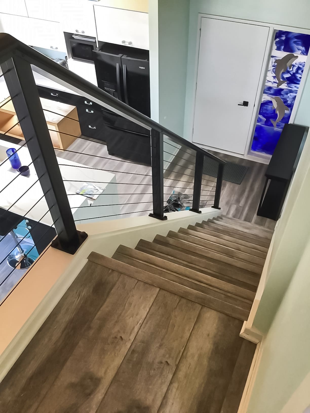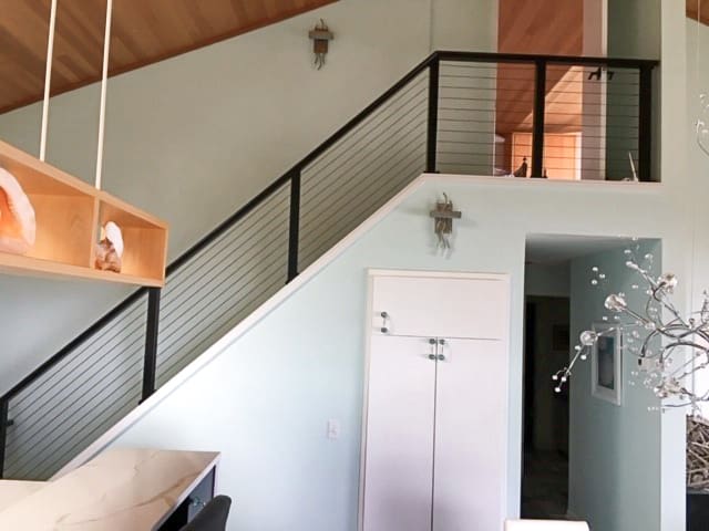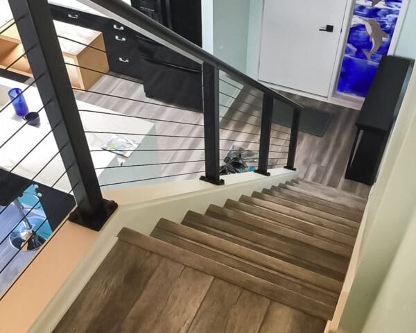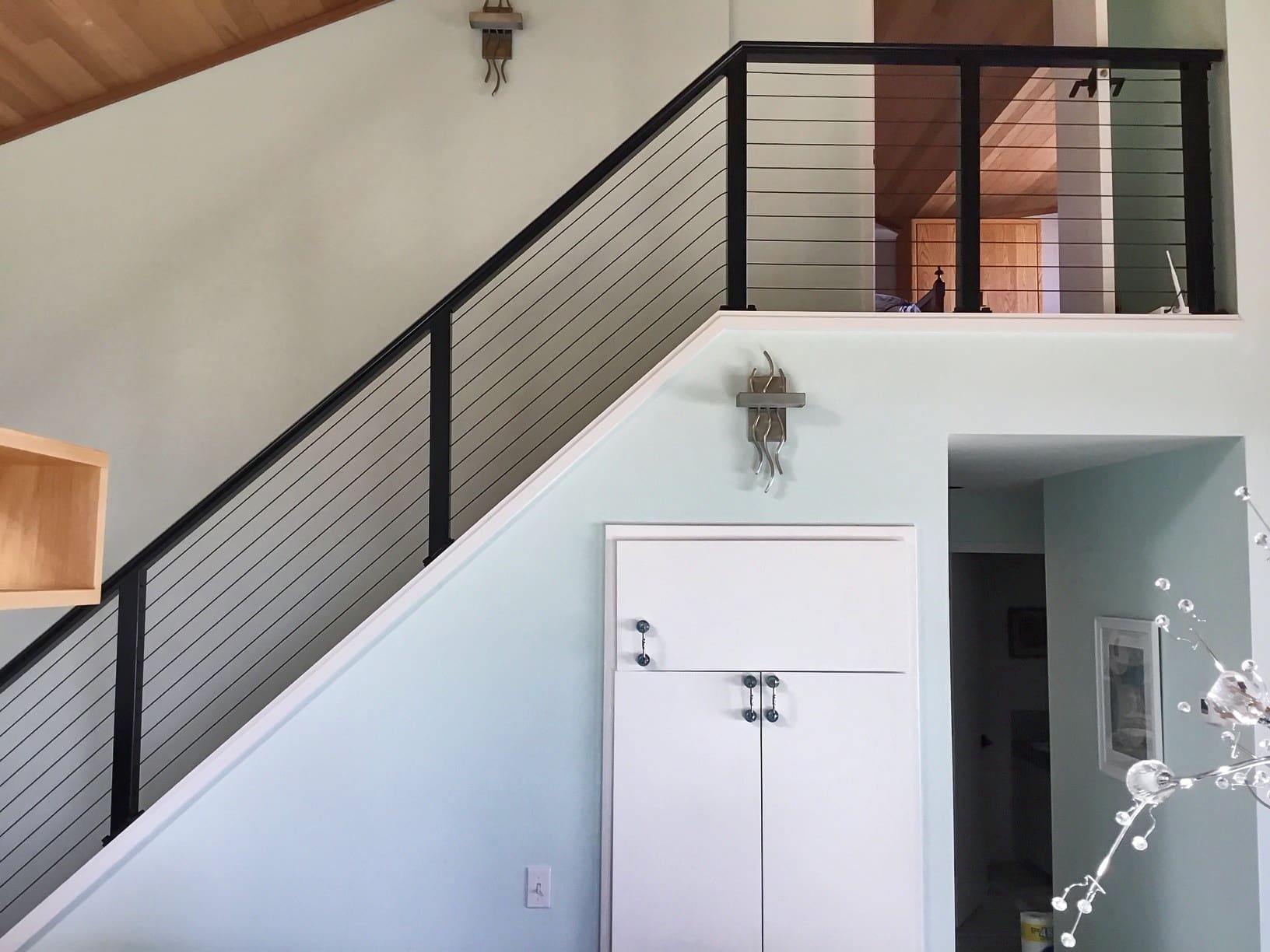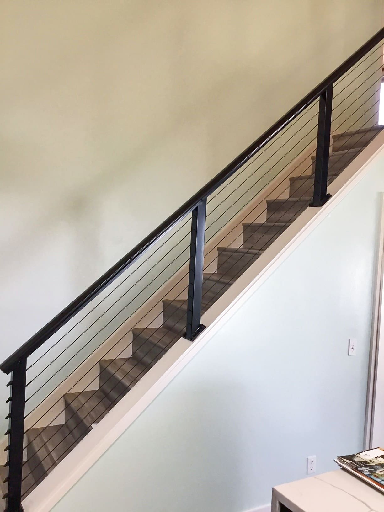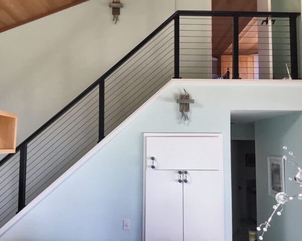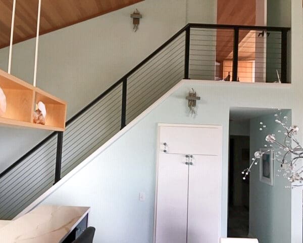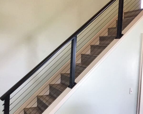 With a light color palette and airy atmosphere to their home, this homeowner wanted a solid black railing to ground the living area and stand out dramatically. The black aluminum frame and black oxide cables accomplish this perfectly.