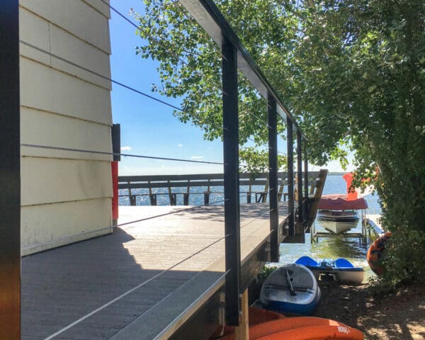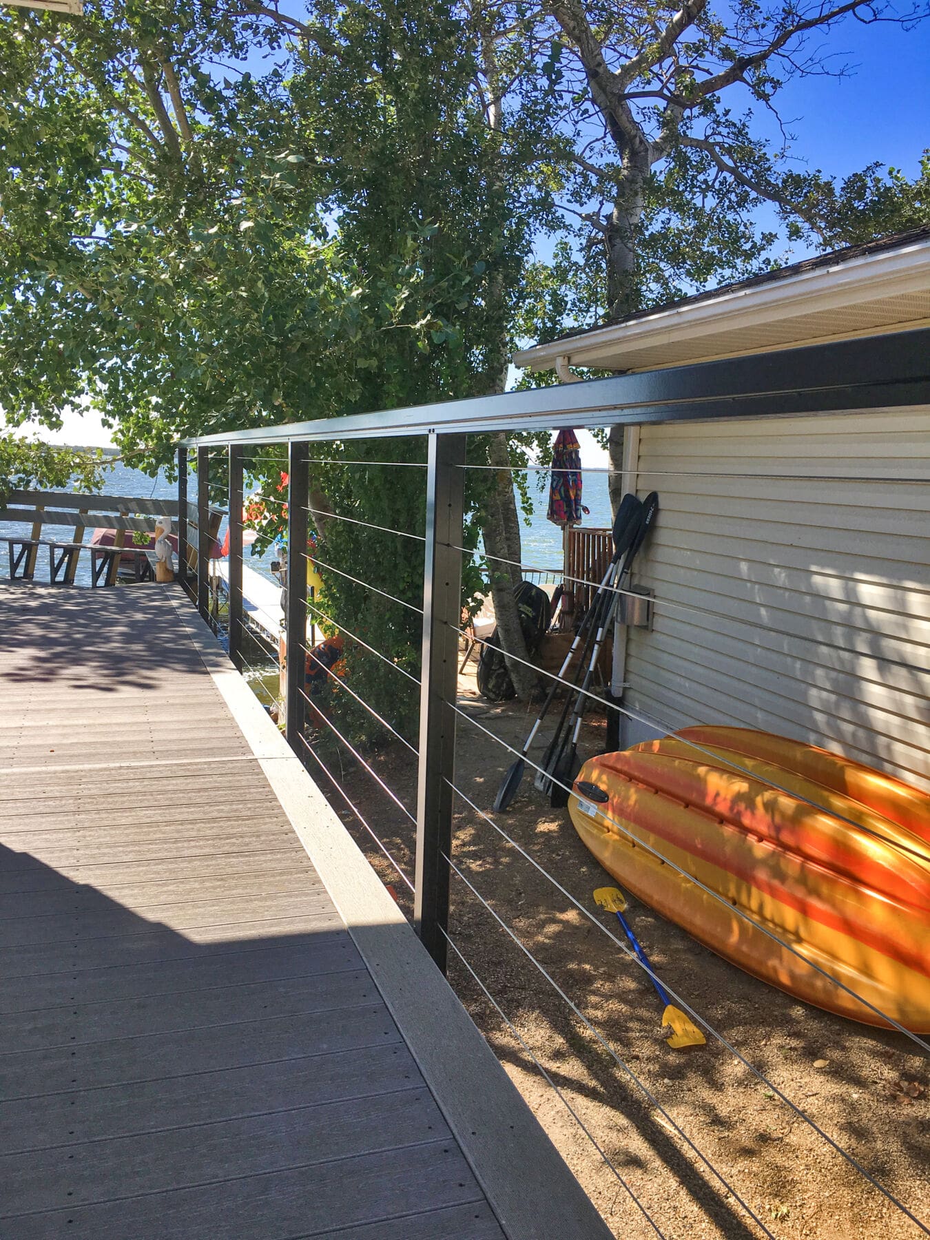 With a picturesque view of the lake, this wrapping deck needed something open and resilient. The black aluminum provides a dramatic frame for the deep blue water and sky stretching into the horizon, while the cable is virtually invisible.