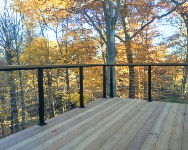 This simple marriage of dark metal and light wood draws the eye to the edges of the deck and the autumn forest beyond.