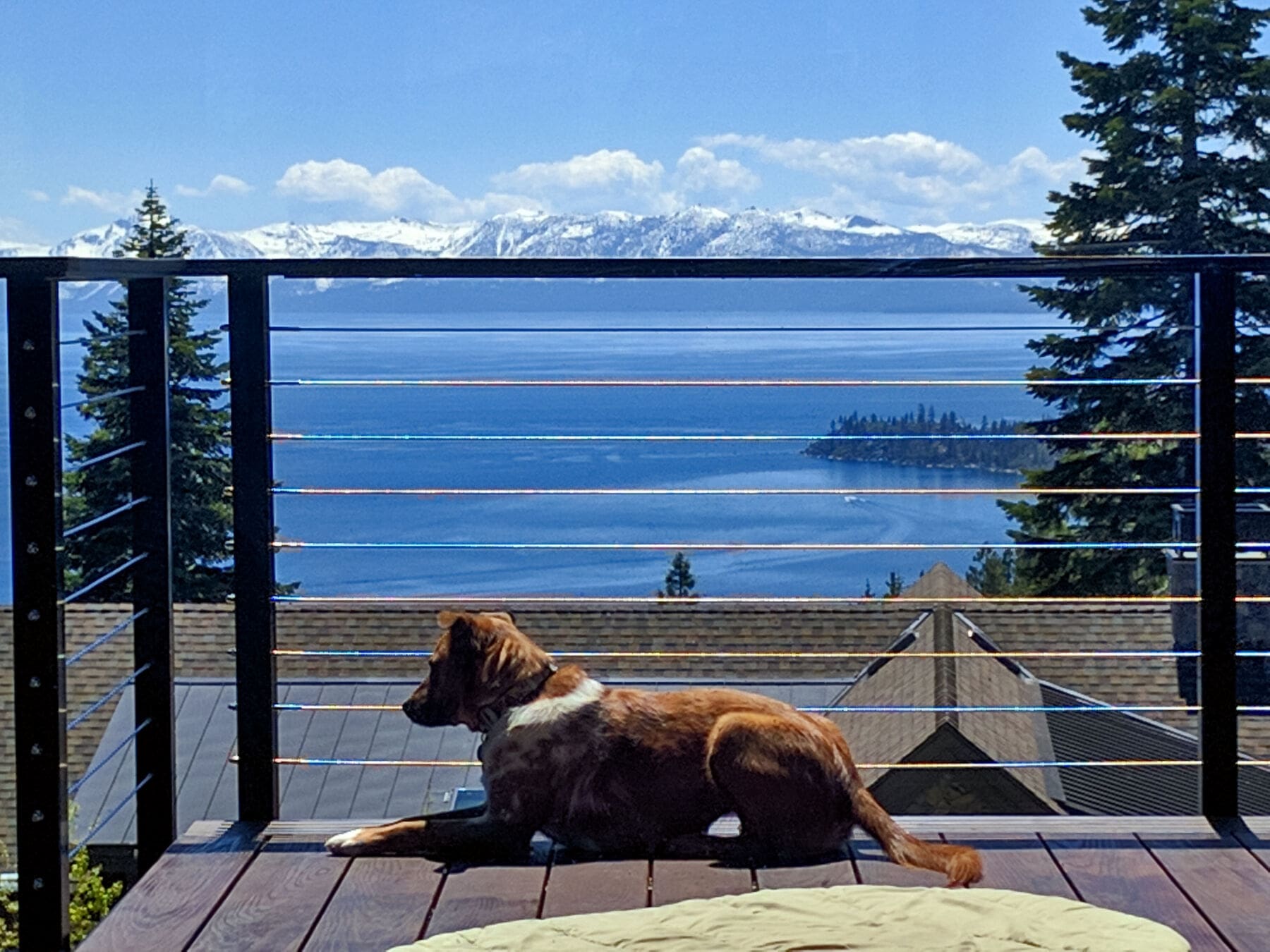 Our black aluminum posts and stainless steel fittings perfectly frame this beautiful view of a mountain range in Nevada and the expansive lake in front of it. The view's so stunning that even this homeowner's dog can't help but soak it in.