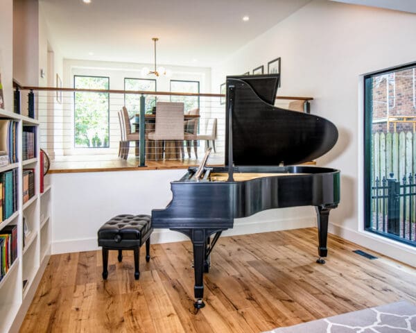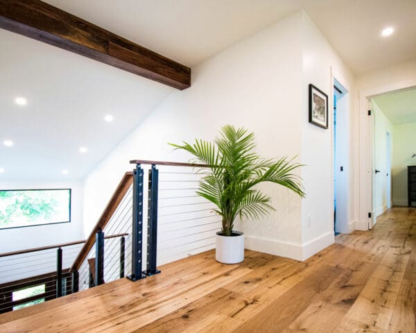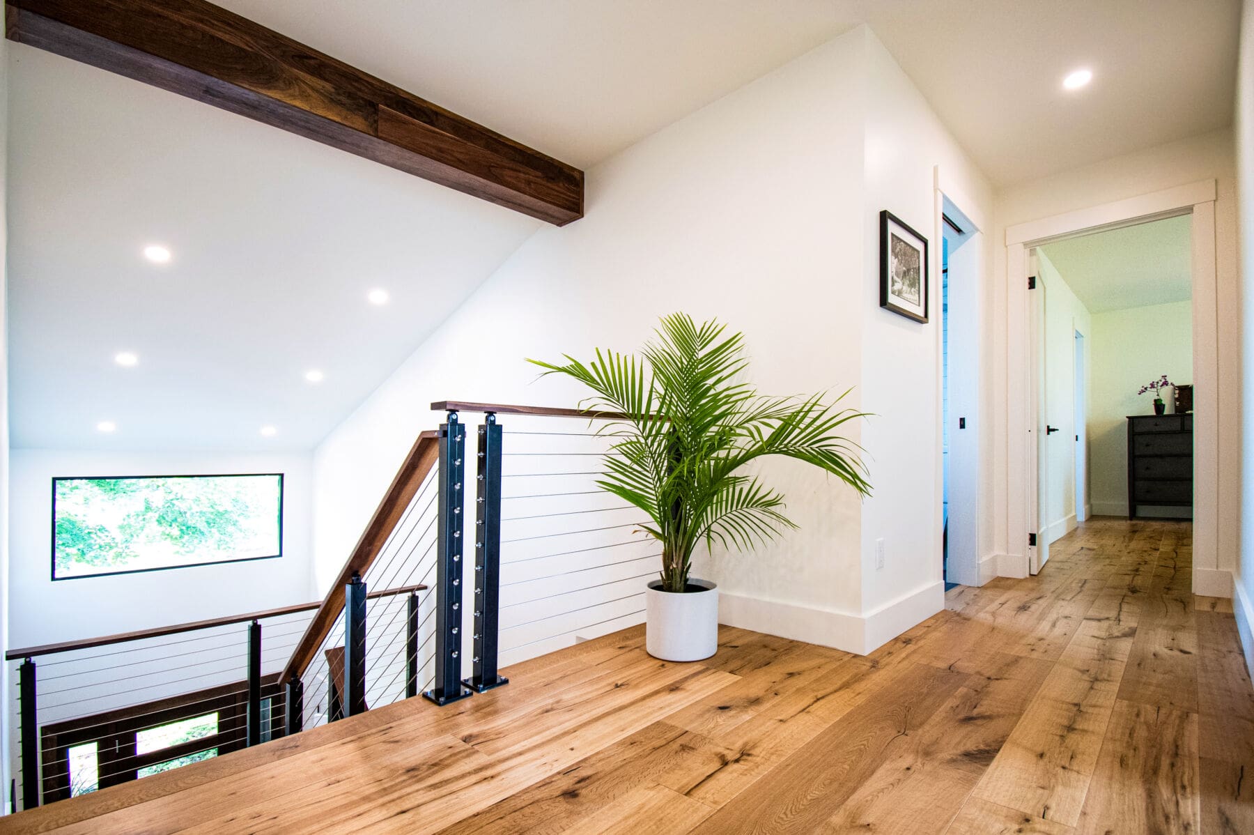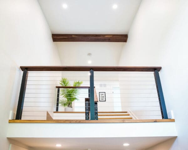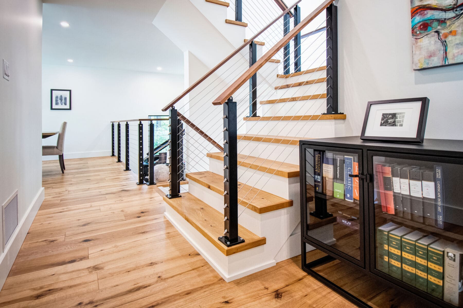Featuring white walls and rich woods, this home in Oakville, Ontario is both impressive and inviting. Black aluminum cable railing keeps the space open and adds dark accents to the bright color scheme.