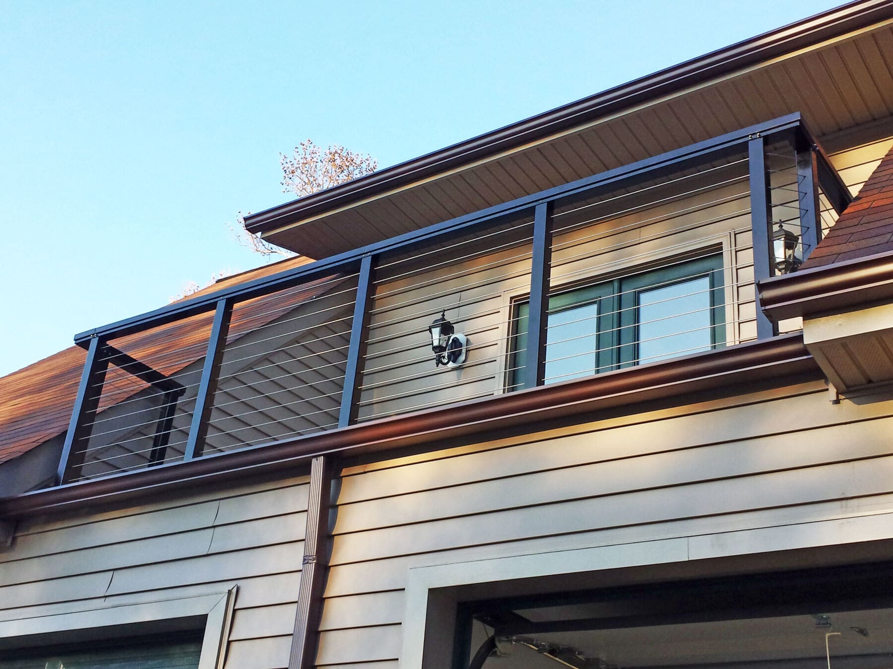 This homeowner in Virginia wanted a pair of railings that kept their view open, but stood out against the creamy palette of their home. The exterior railing is topped with our popular rectangular rail, while the interior has our thinner Post-To-Post Handrail.