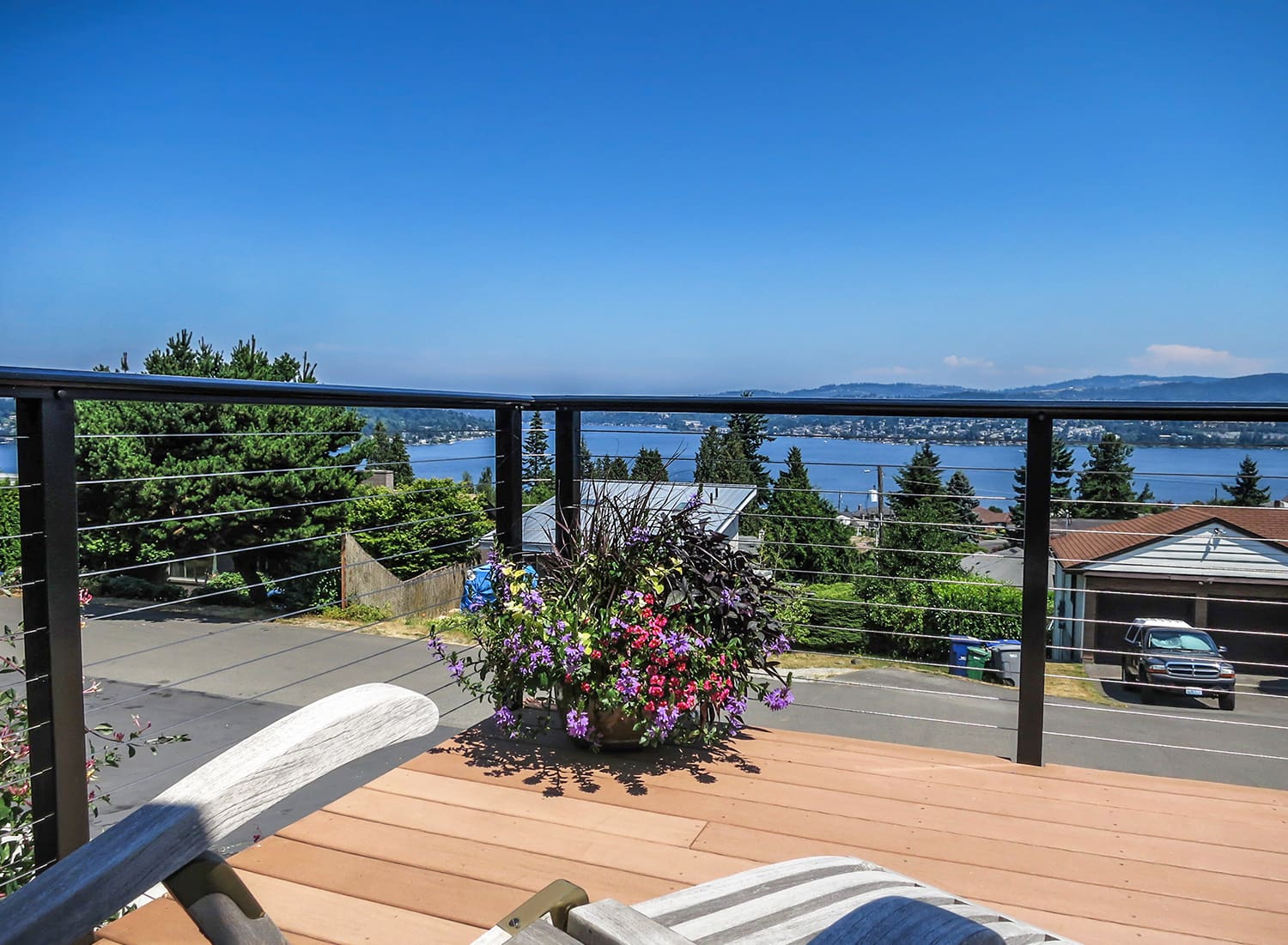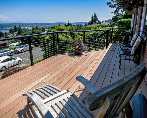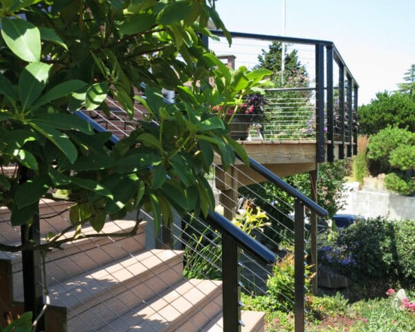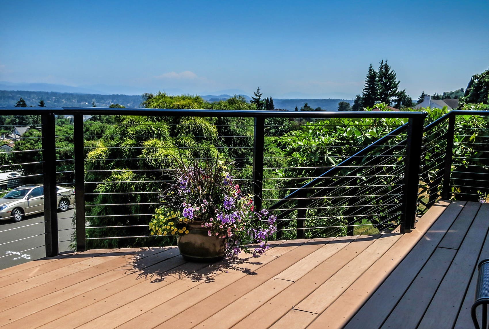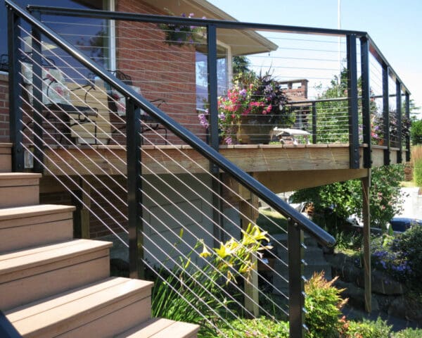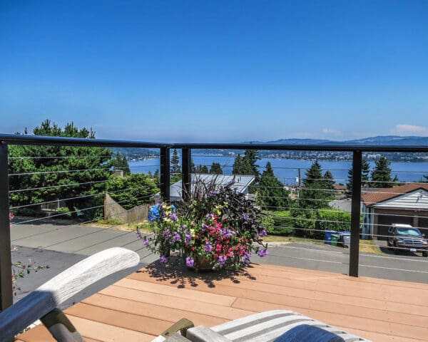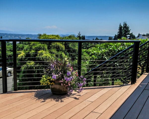 This elevated entry and front-yard deck maintains it's stunning view of a lake and hills in Seattle, Washington through the use of our cable railing. The black frame and shaped top rail are strikingly stylish and reflect the blue sky of this summer day. By fascia-mounting the posts, the homeowners keep this small deck from feeling cramped and make the most of their horizontal space.