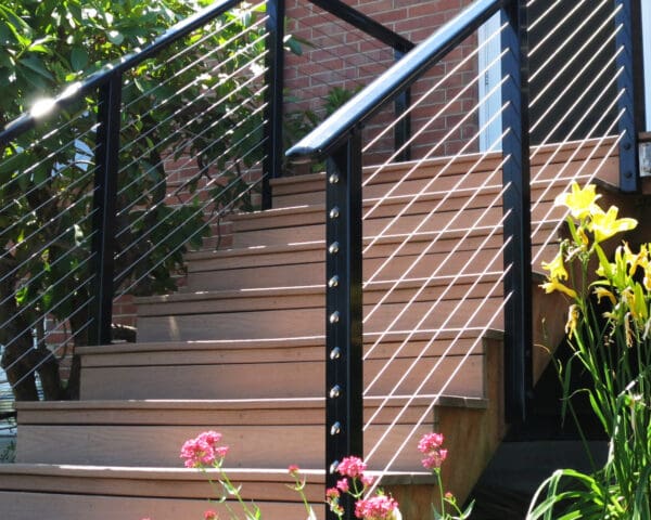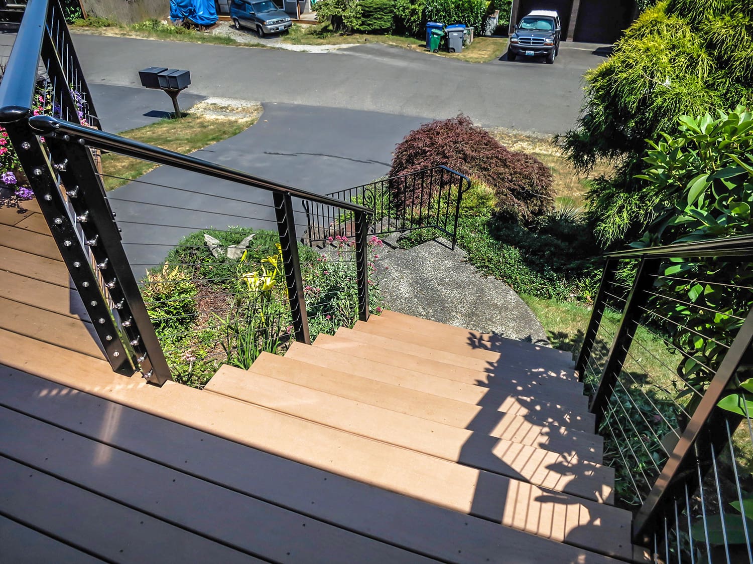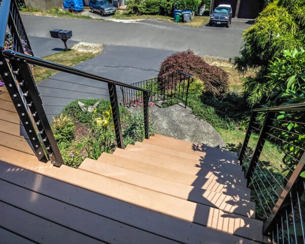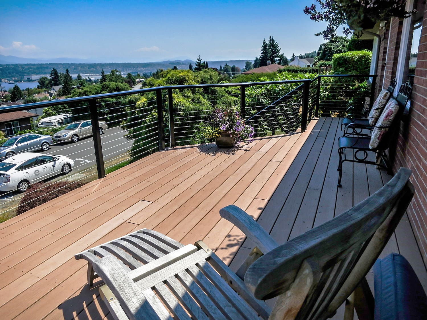 This elevated entry and front-yard deck maintains it's stunning view of a lake and hills in Seattle, Washington through the use of our cable railing. The black frame and shaped top rail are strikingly stylish and reflect the blue sky of this summer day. By fascia-mounting the posts, the homeowners keep this small deck from feeling cramped and make the most of their horizontal space.