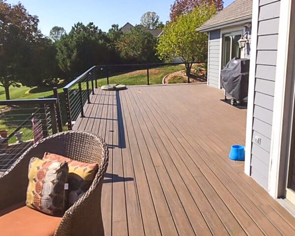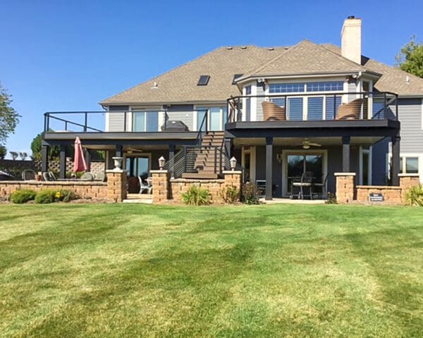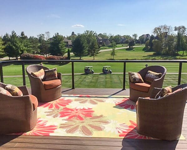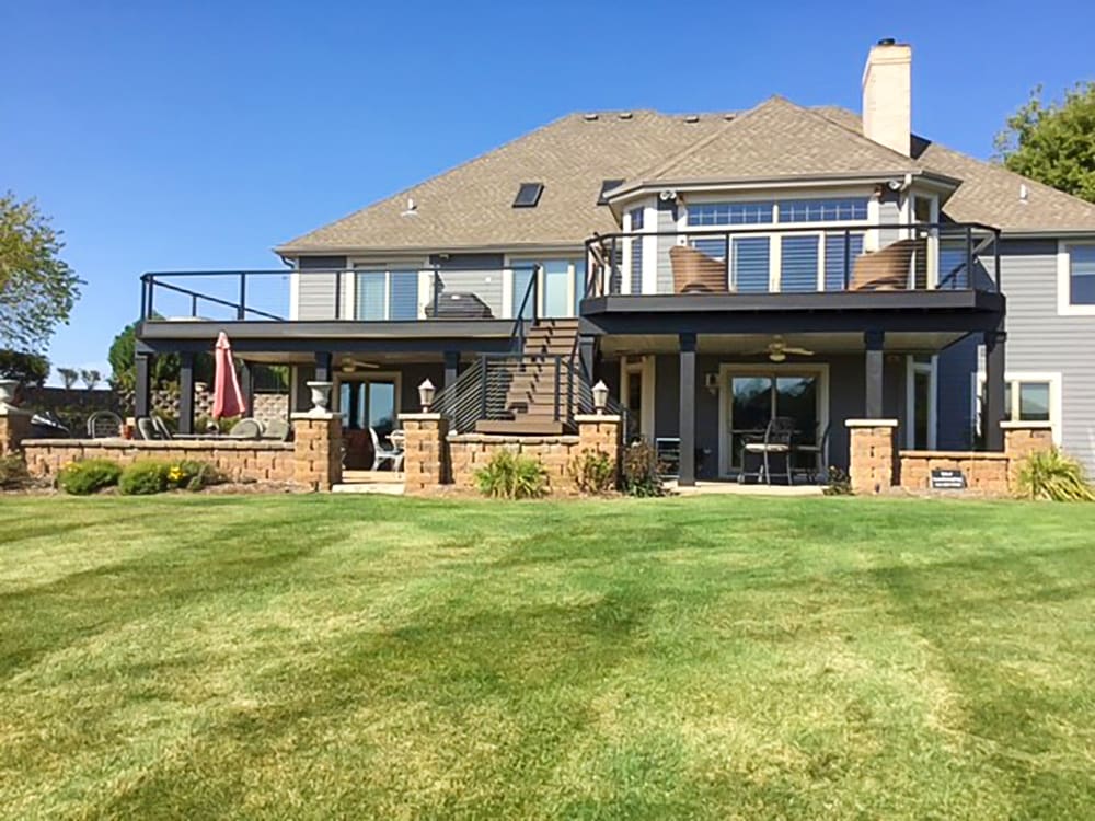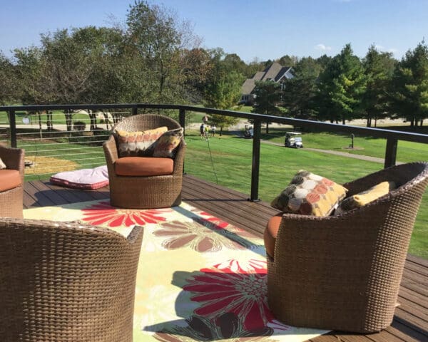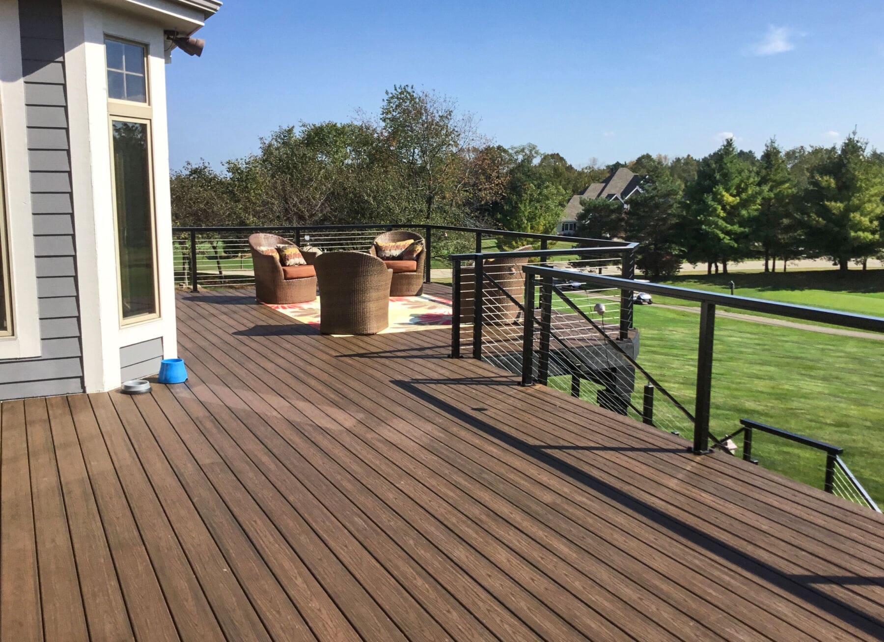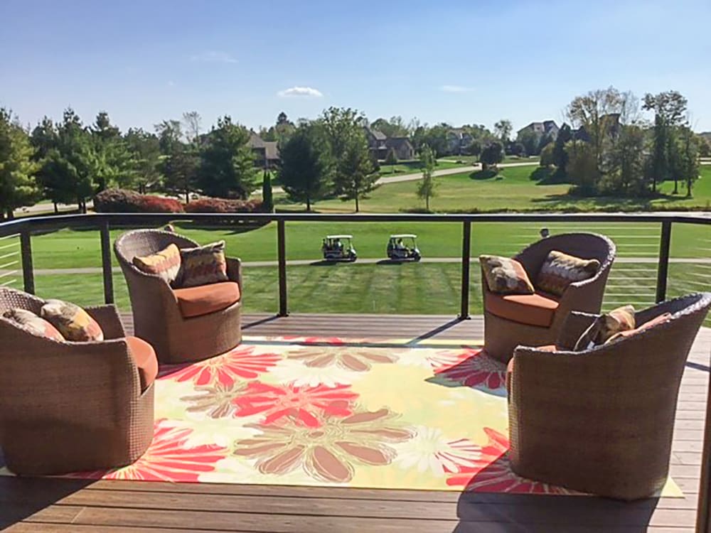 With a stunning view of a neighboring golf course and custom-angle deck corners, this expansive deck and staircase takes full advantage of our open and flexible design.
