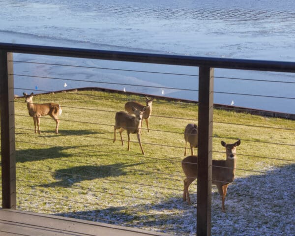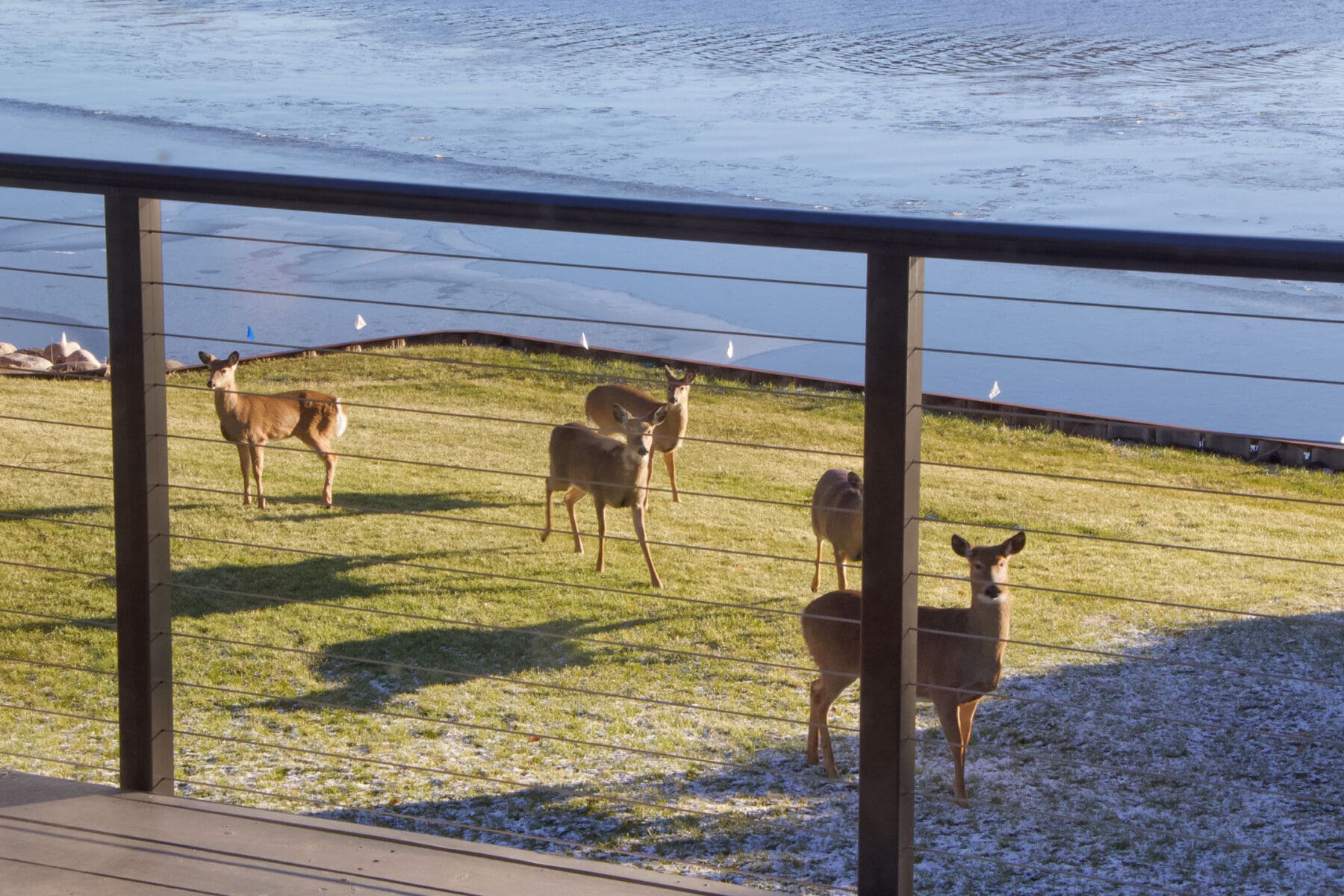 In an area surrounded by beautiful scenery and wildlife, this homeowner installed cable railing, allowing them to embrace every bit of their view. The bronze color emulates the thin limbs of trees, providing a natural frame to a waterside scene of feasting deer.