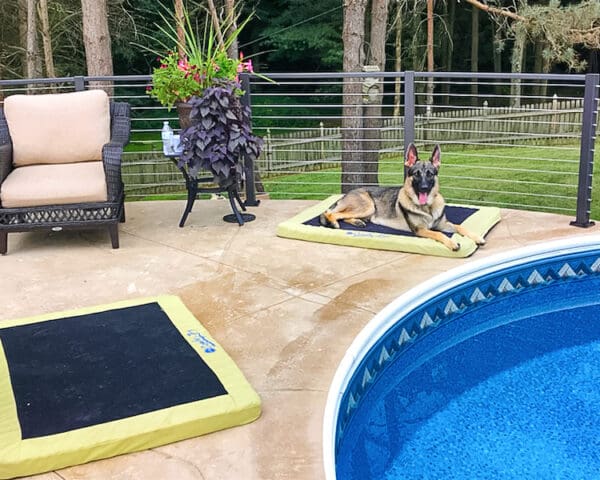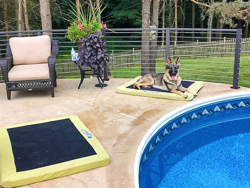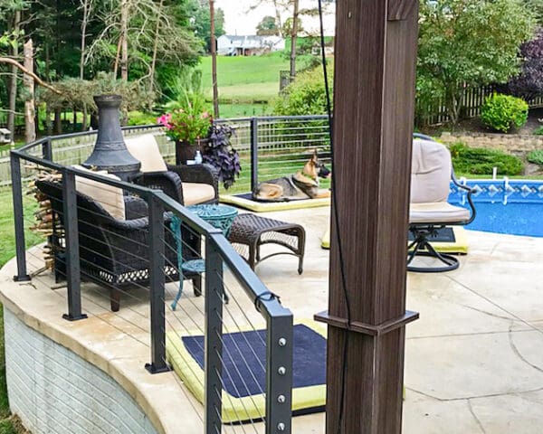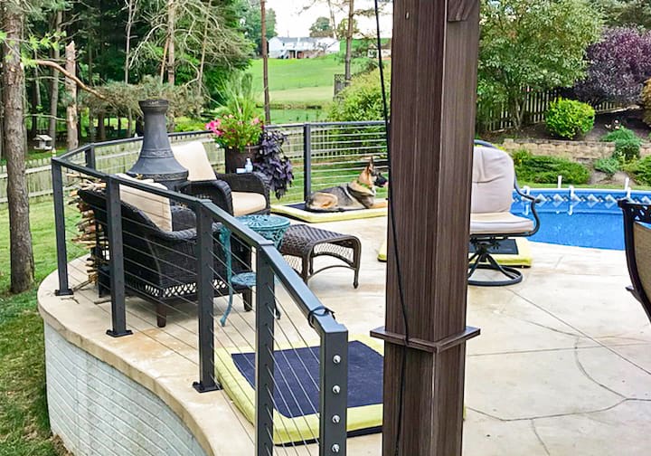 This elevated pool and the patio surrounding it required a railing for family safety, but the homeowners didn't want the pool area to feel too closed off from the rest of the yard. Our bronze cable railing was the perfect solution!