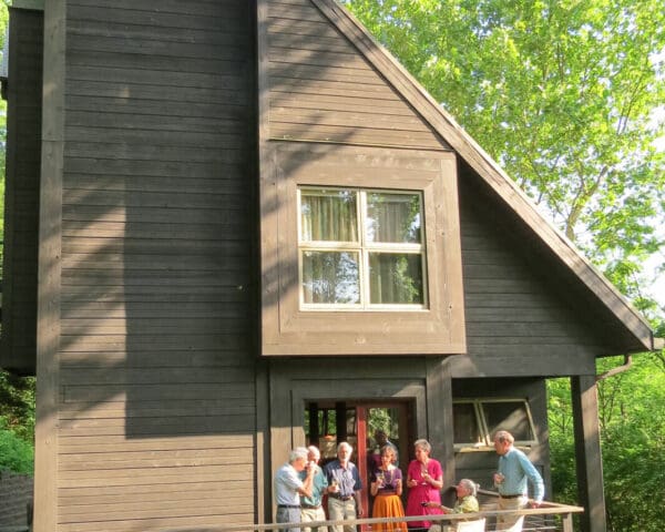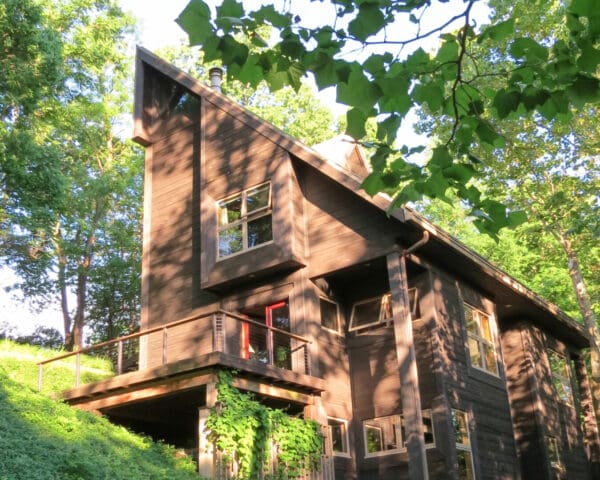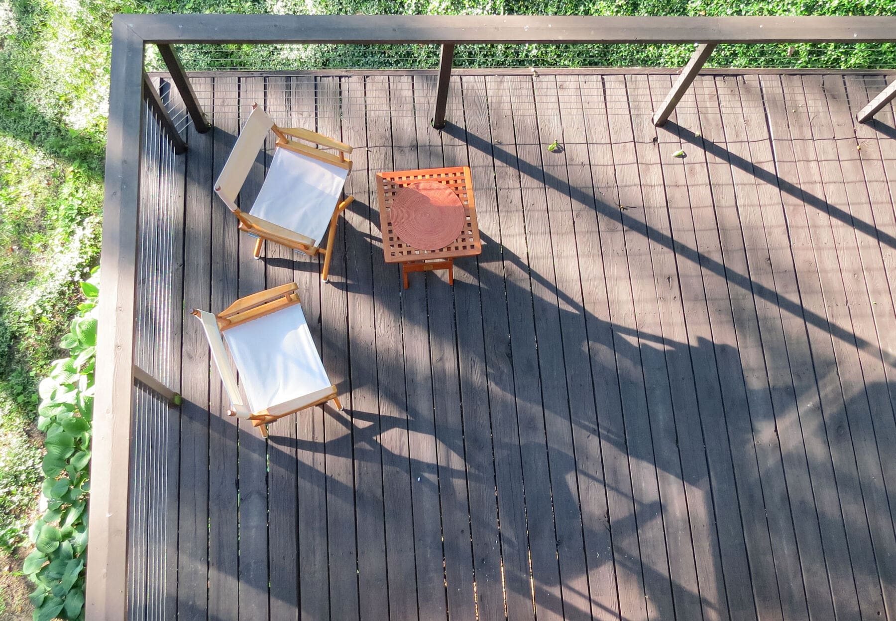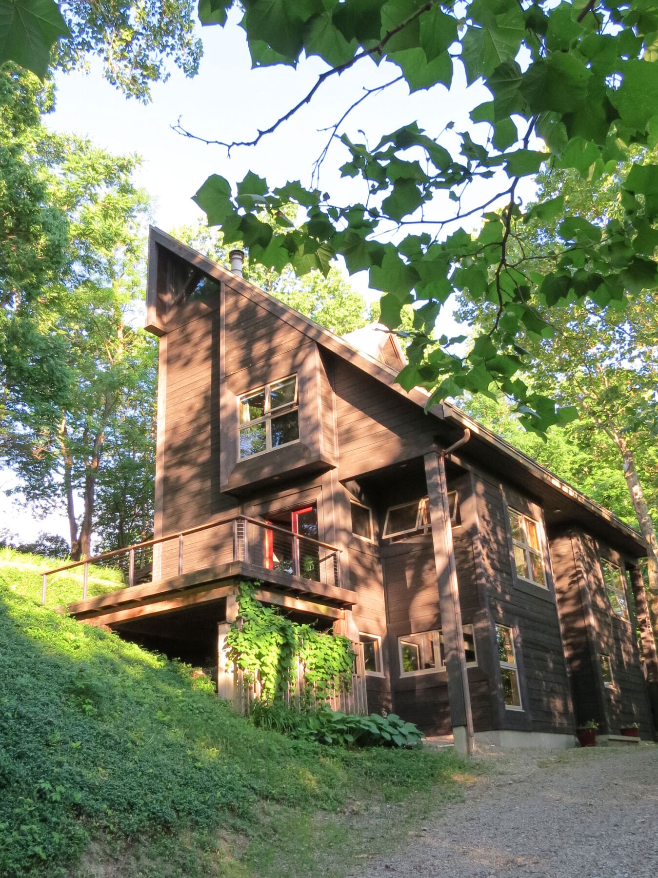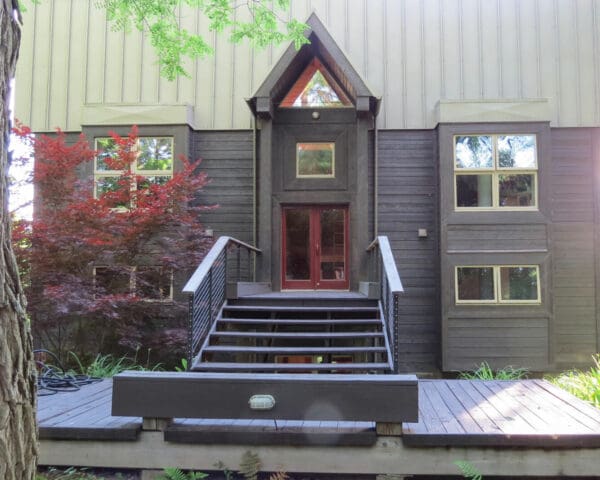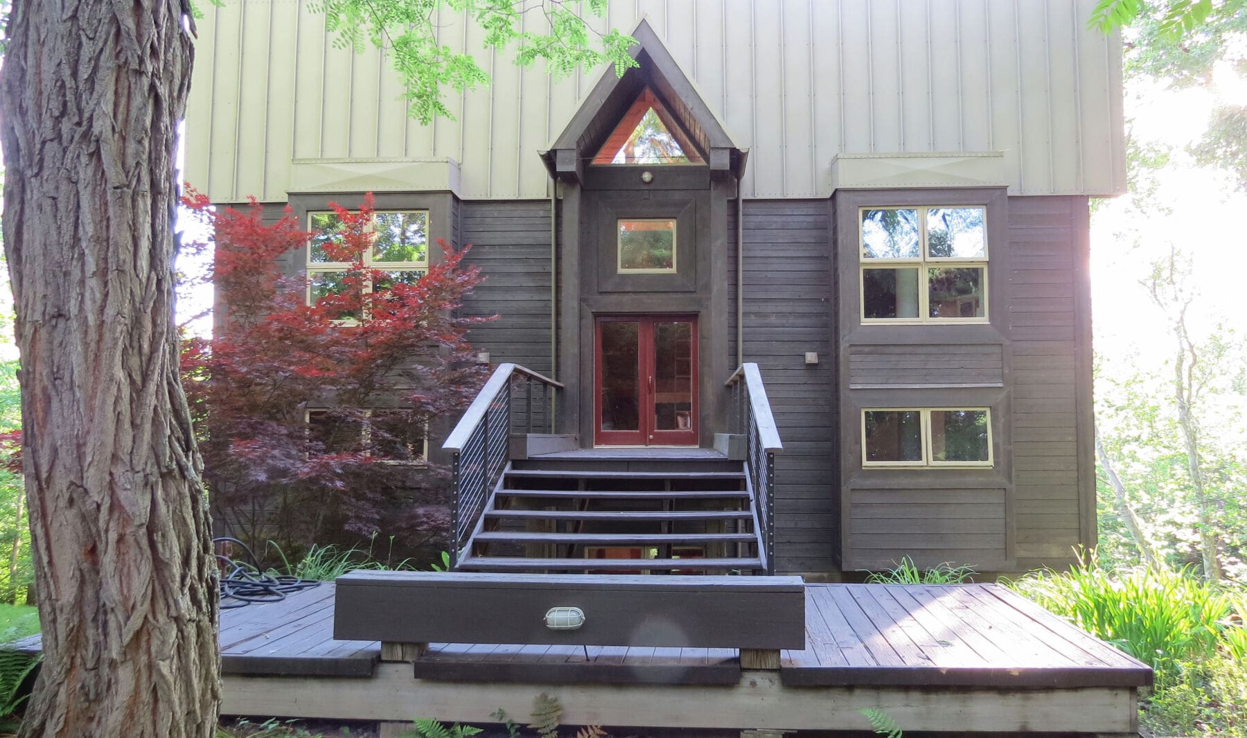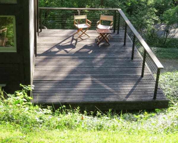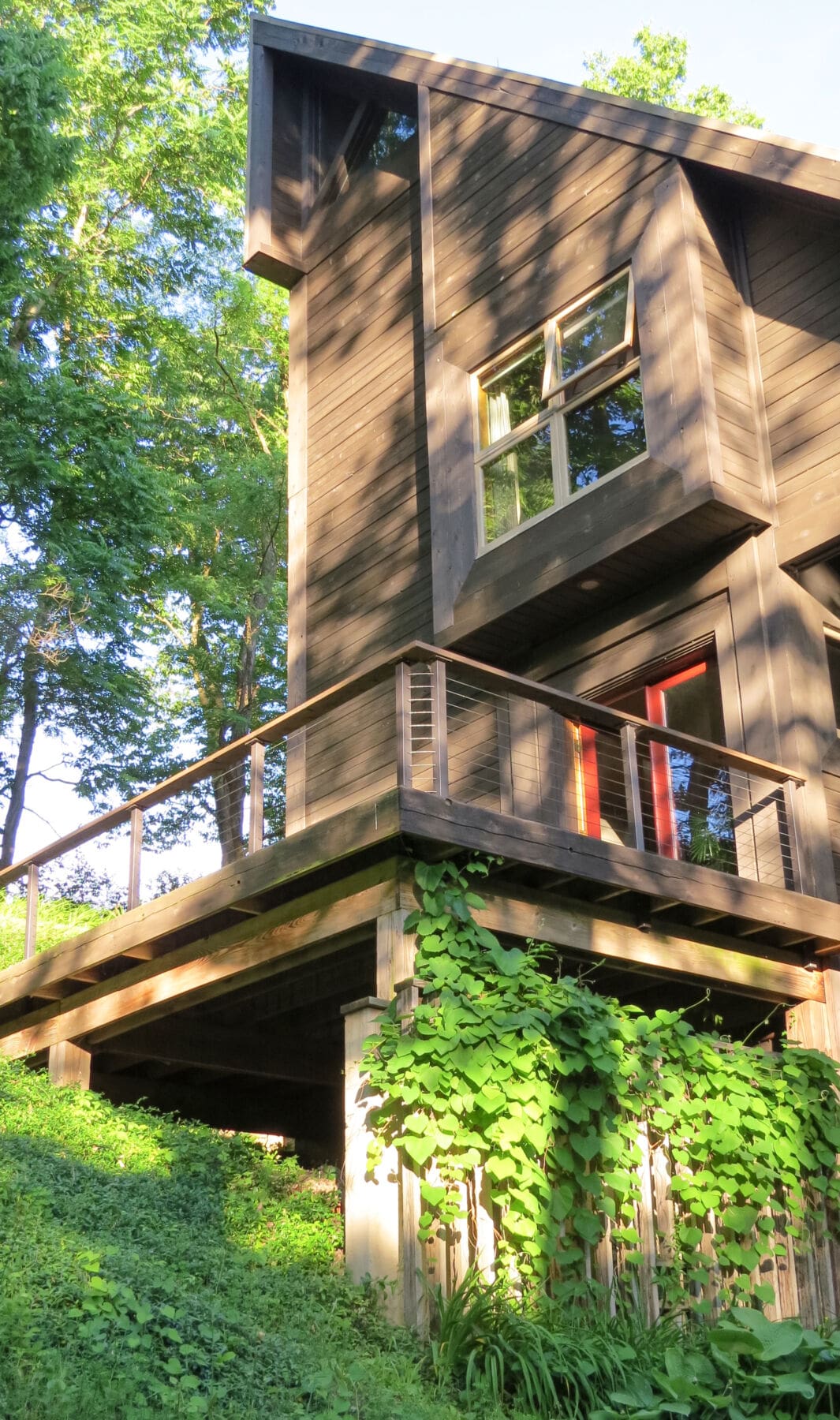 The style and color of our railing blends beautifully with the earthy tones and wood plank siding of this forested house in the hills of Ohio.