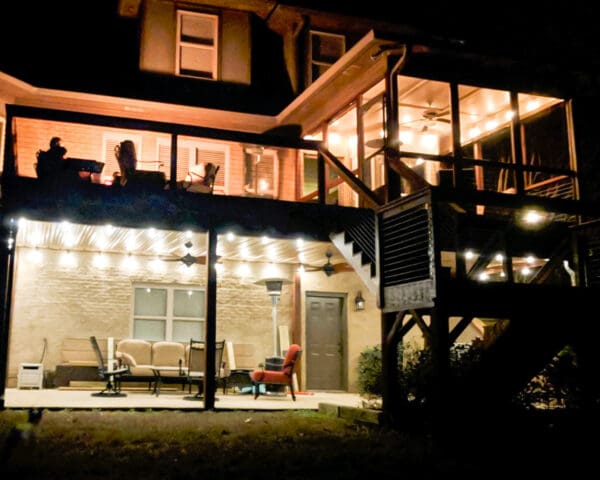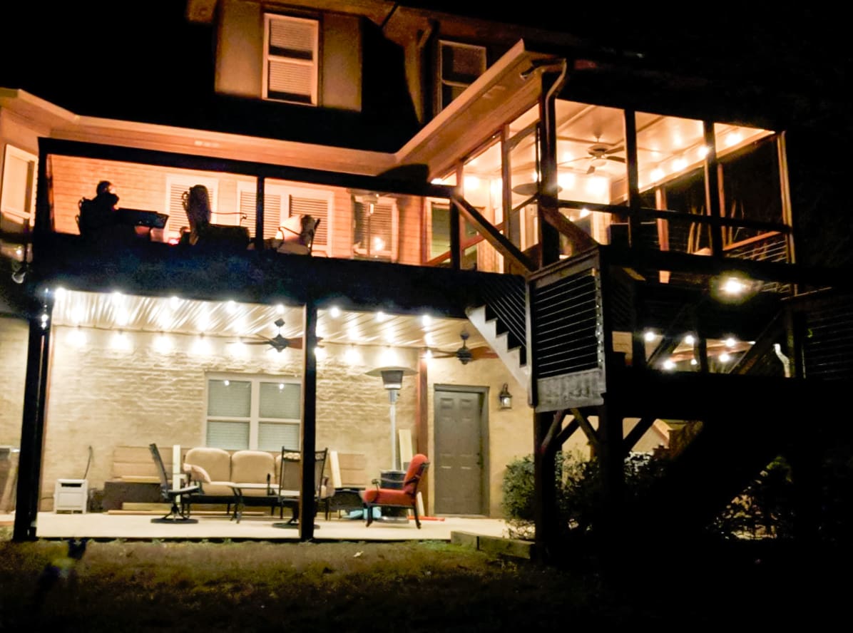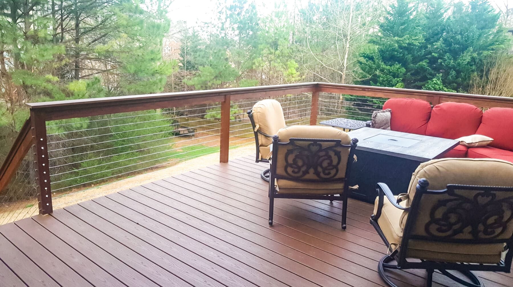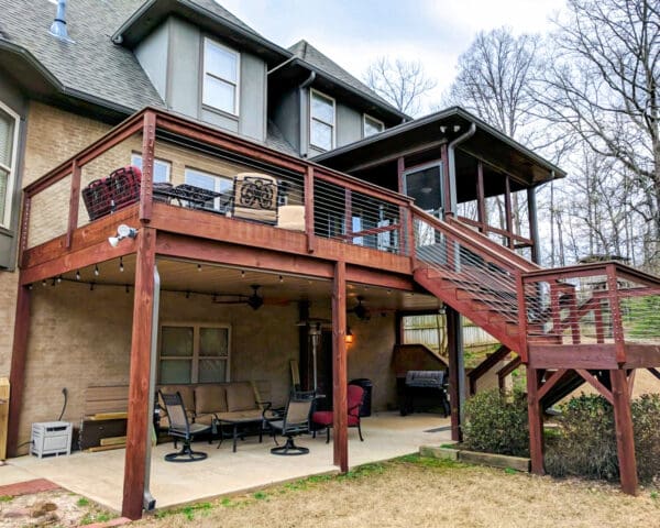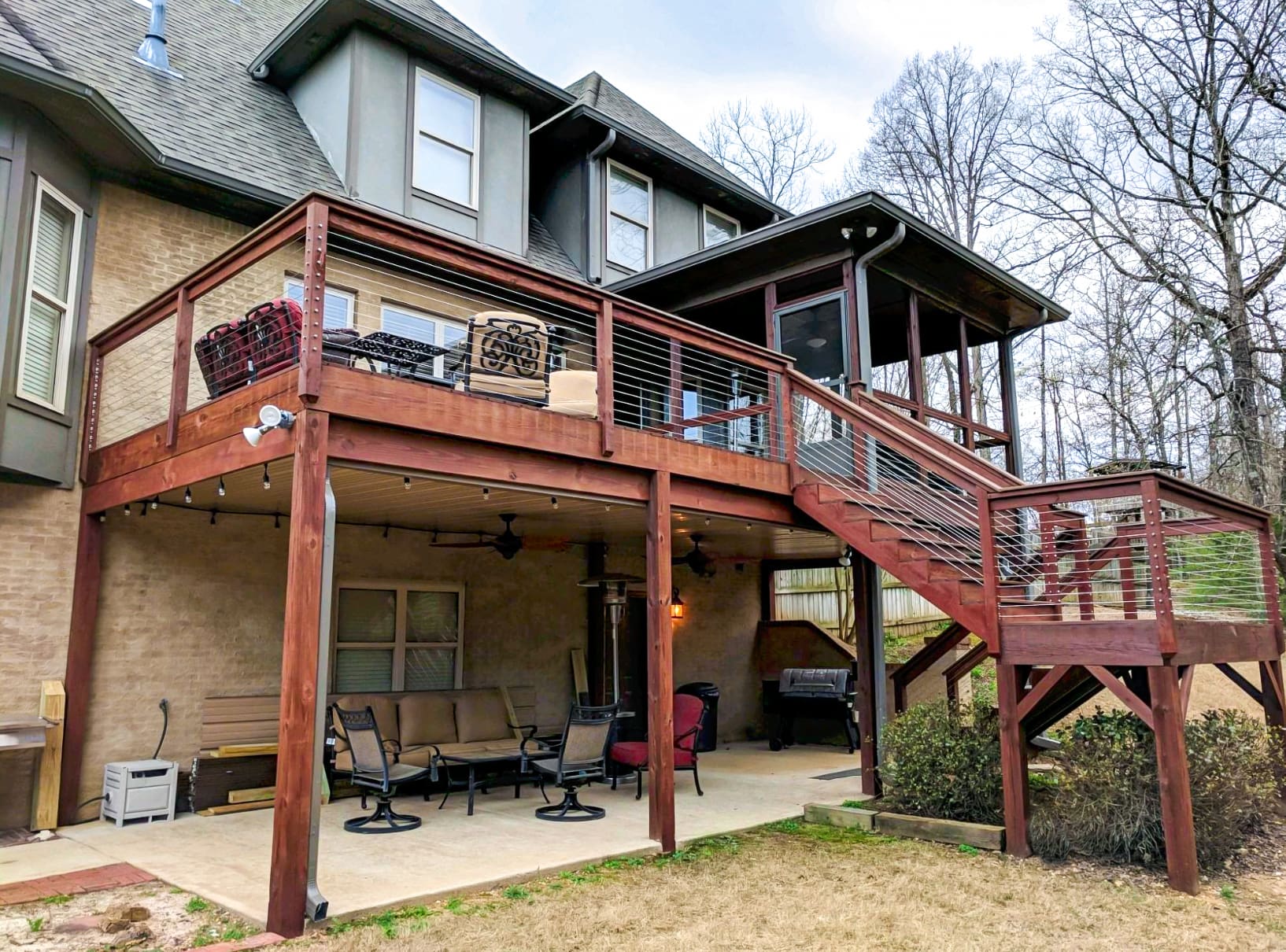 Cable infill keeps this this two-story backyard entertainment area open to nature.
