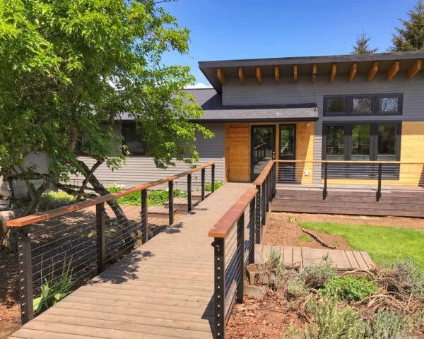 Cable railing offers extra safety while making a striking statement across the front yard of this contemporary home.