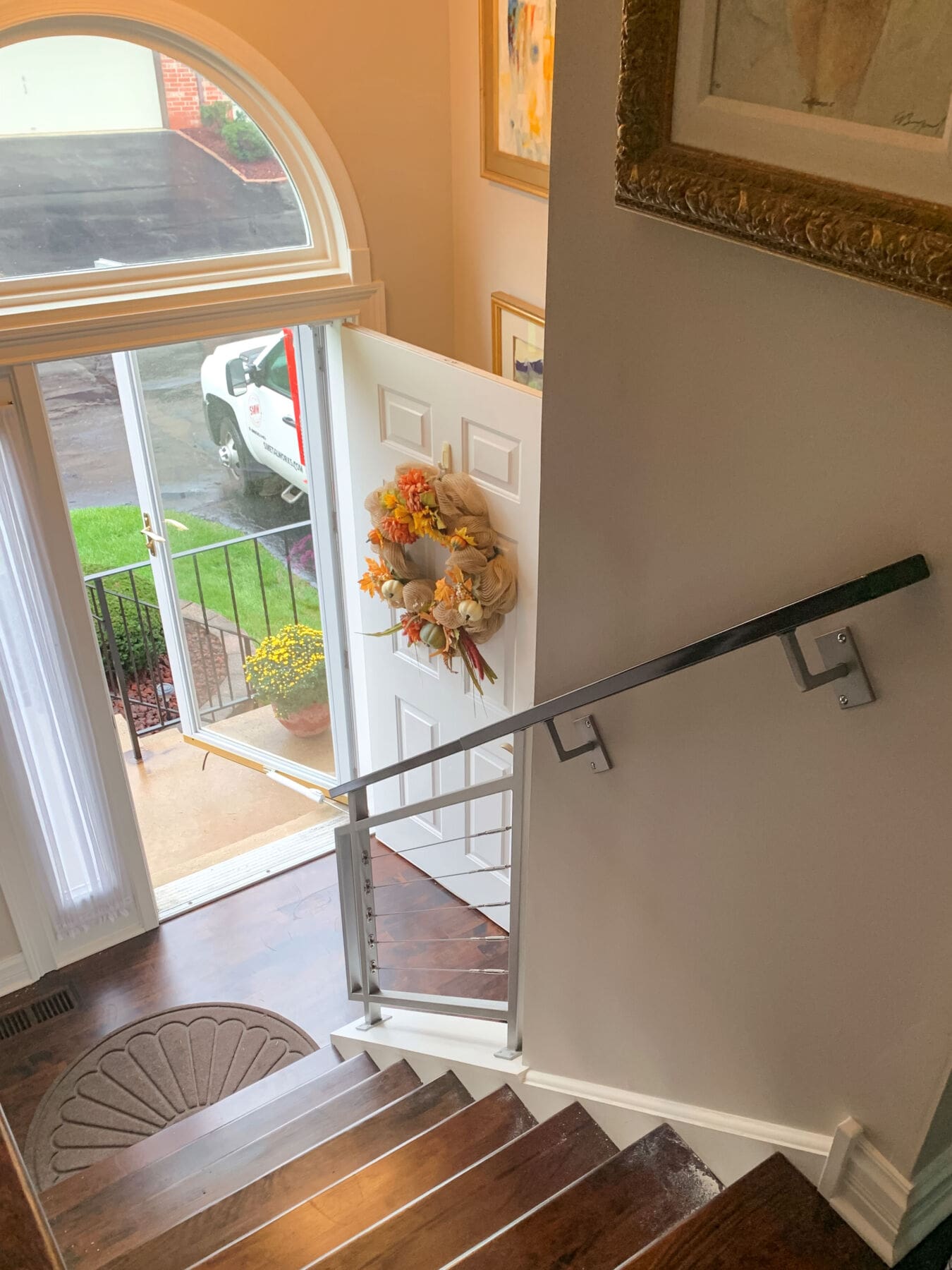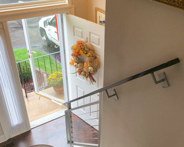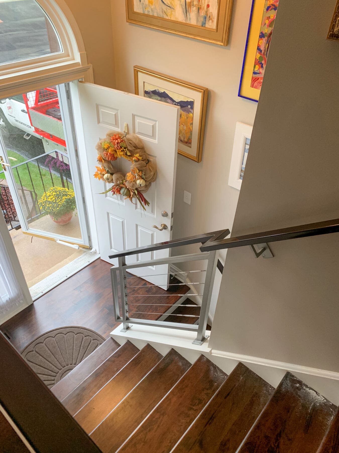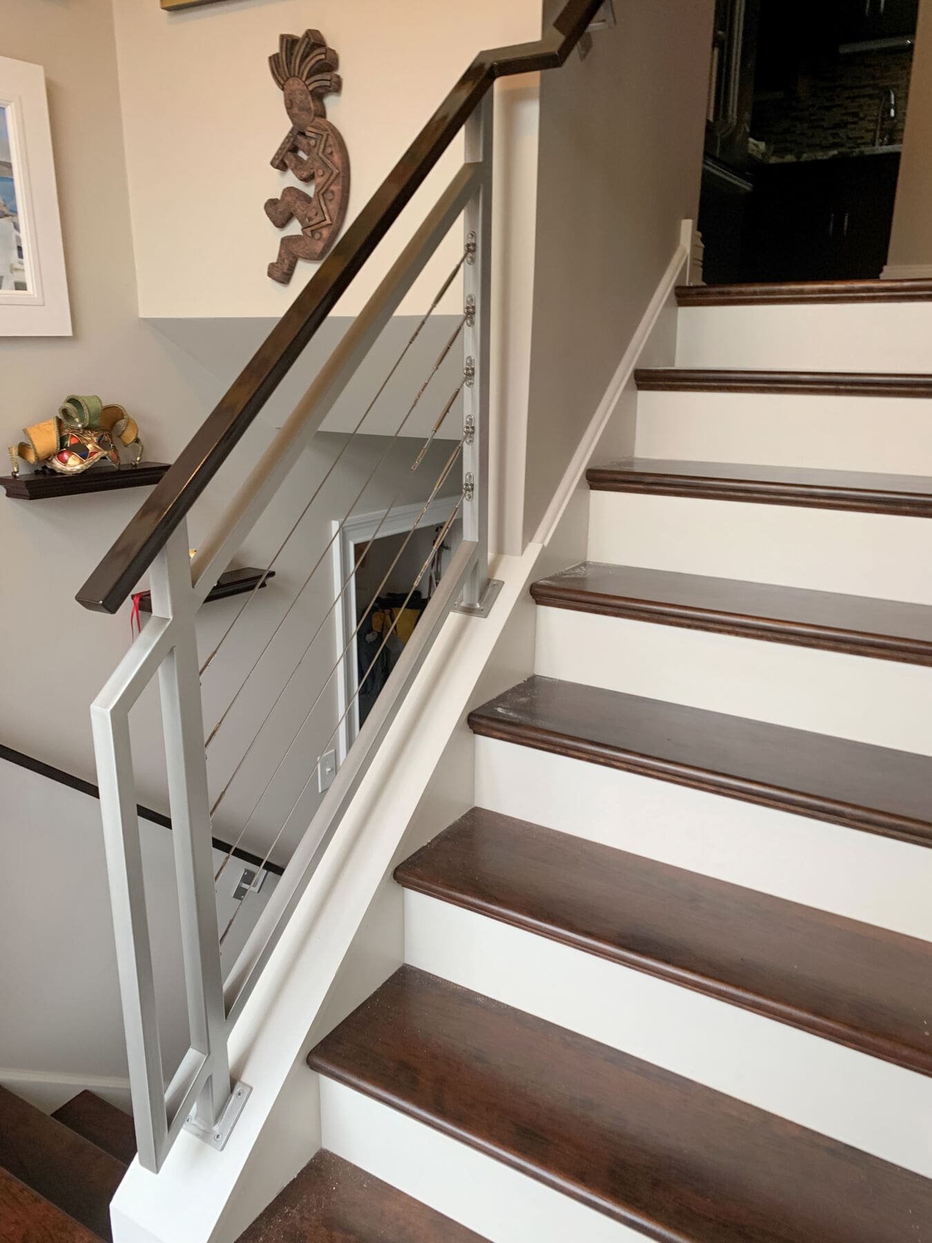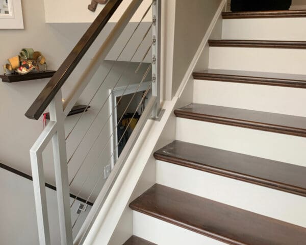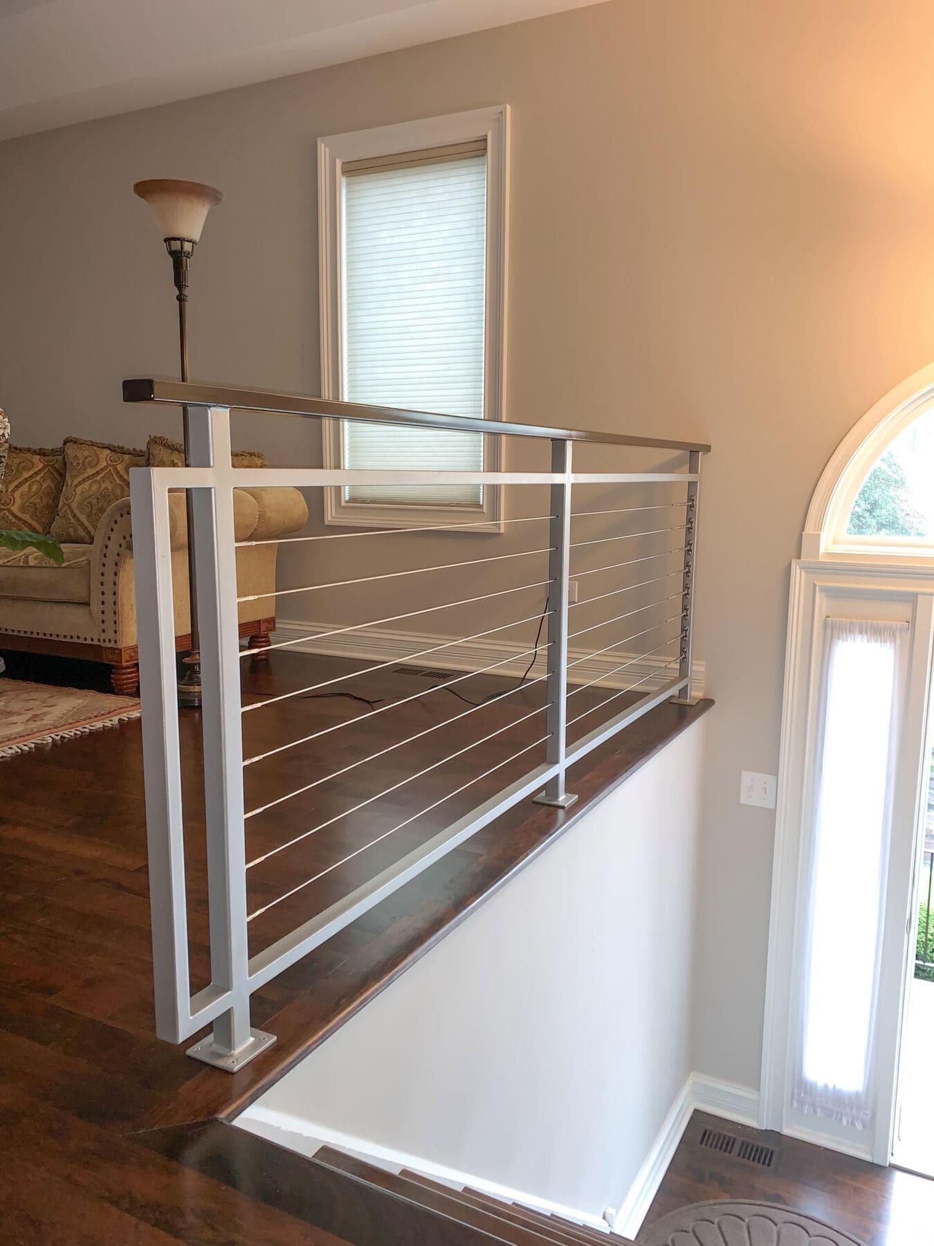 Cable railing offers extra safety while making a striking statement across the front yard of this contemporary home.