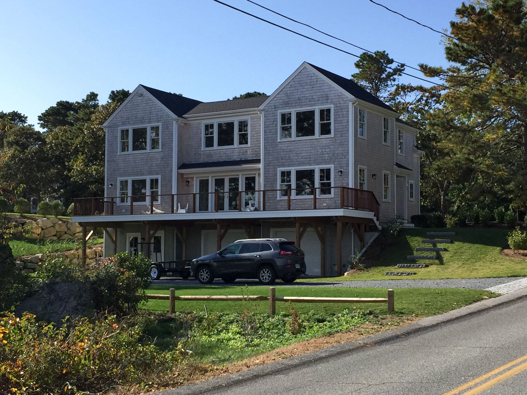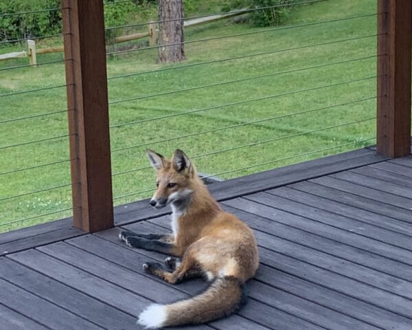 The view from this long deck overlooking the landscape of Chatham, MA is so tempting, even the wildlife can't help but lounge and enjoy. A simple wood cable railing blurs the boundaries between home and nature while providing necessary safety for all guests, including furry ones!