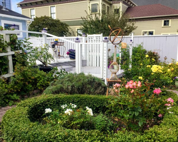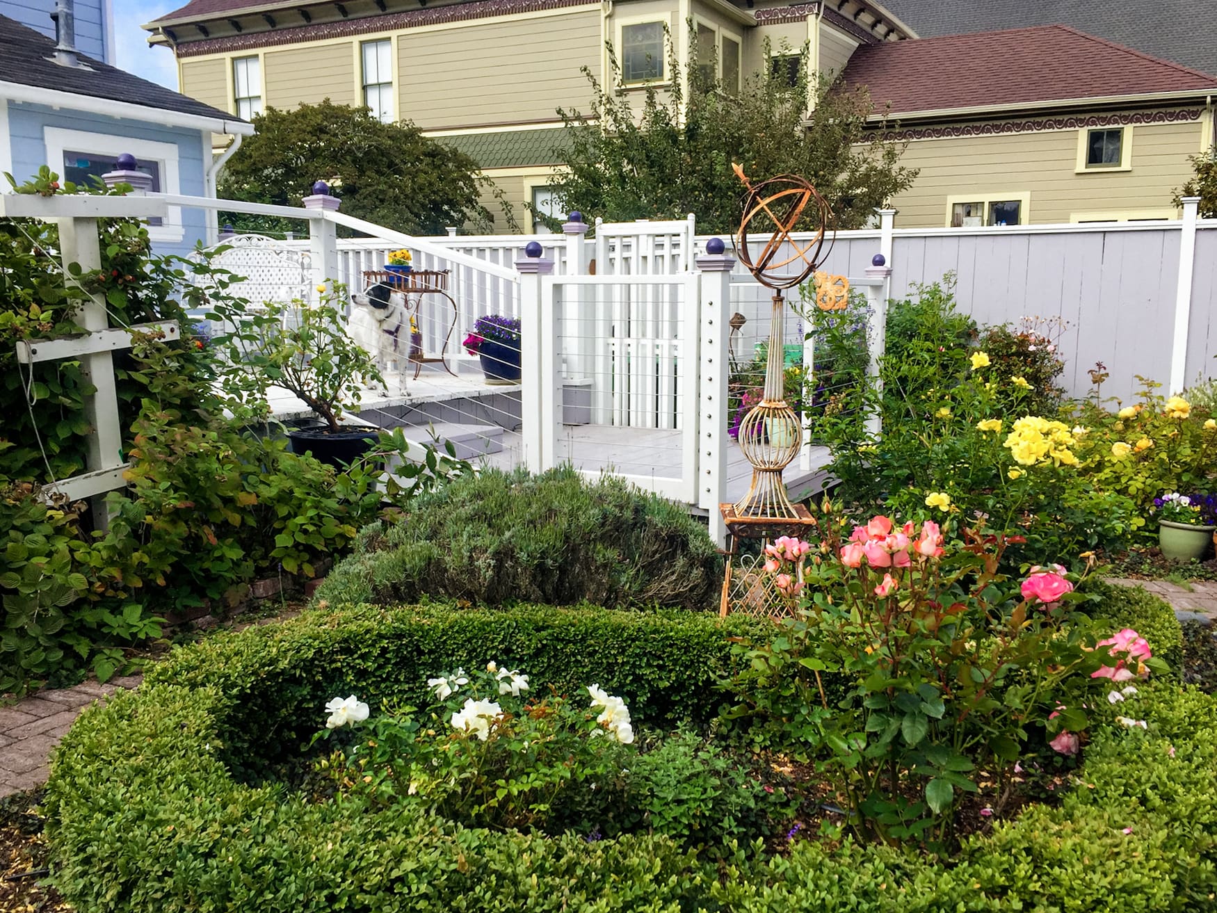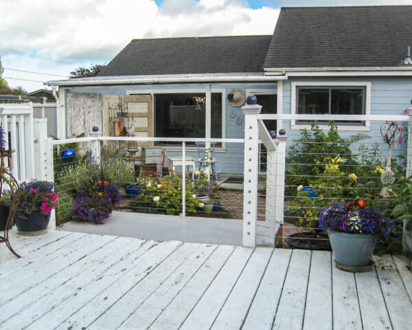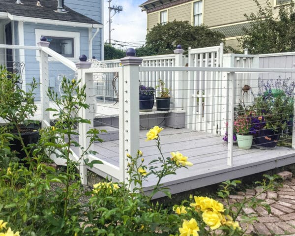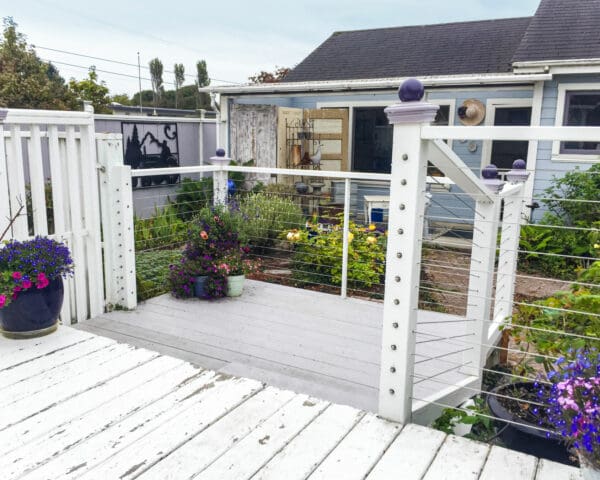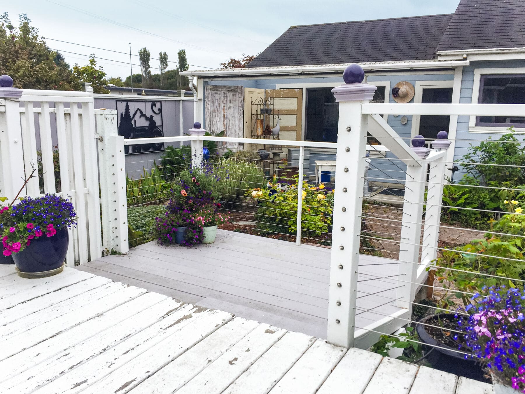 Cable infill is used to complete this customer's wood railing frame. The open design of the finished railing allows the homeowners to effortlessly enjoy their lush backyard garden.