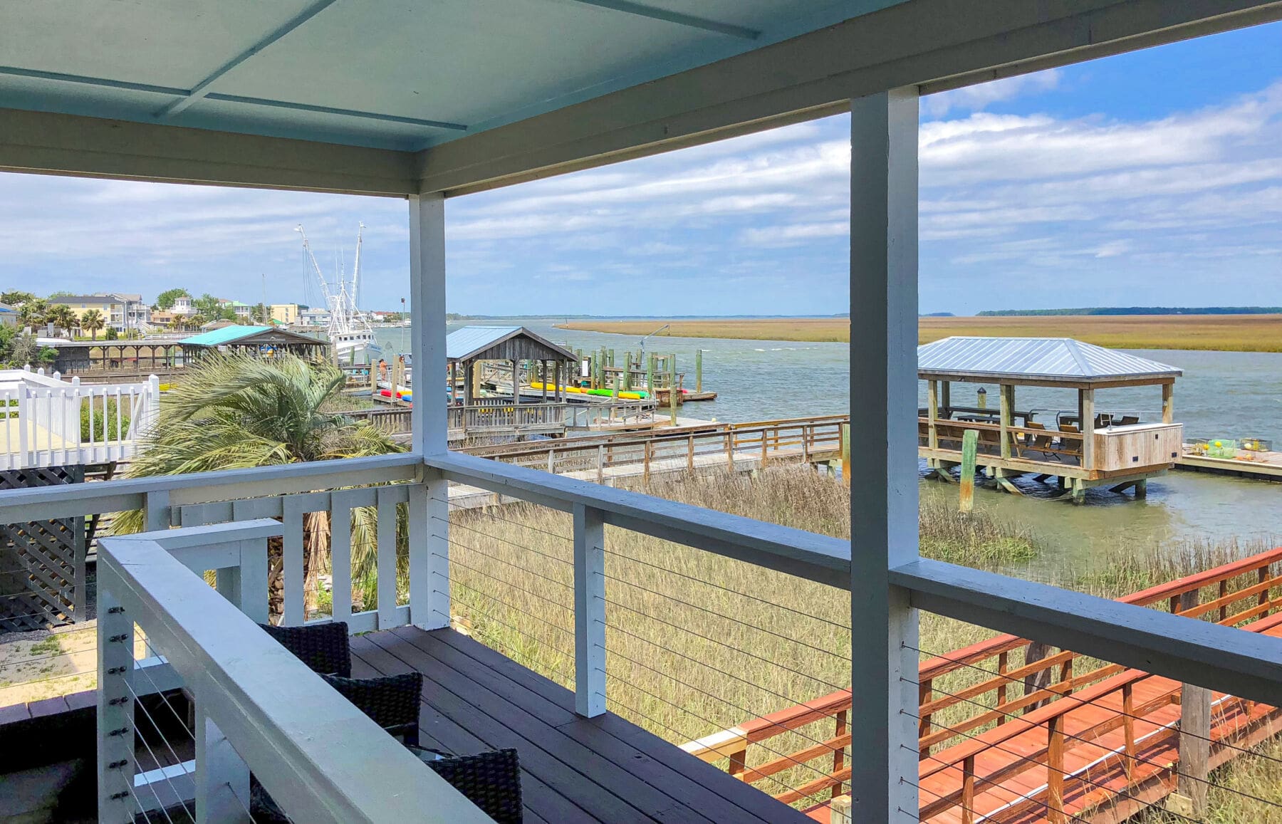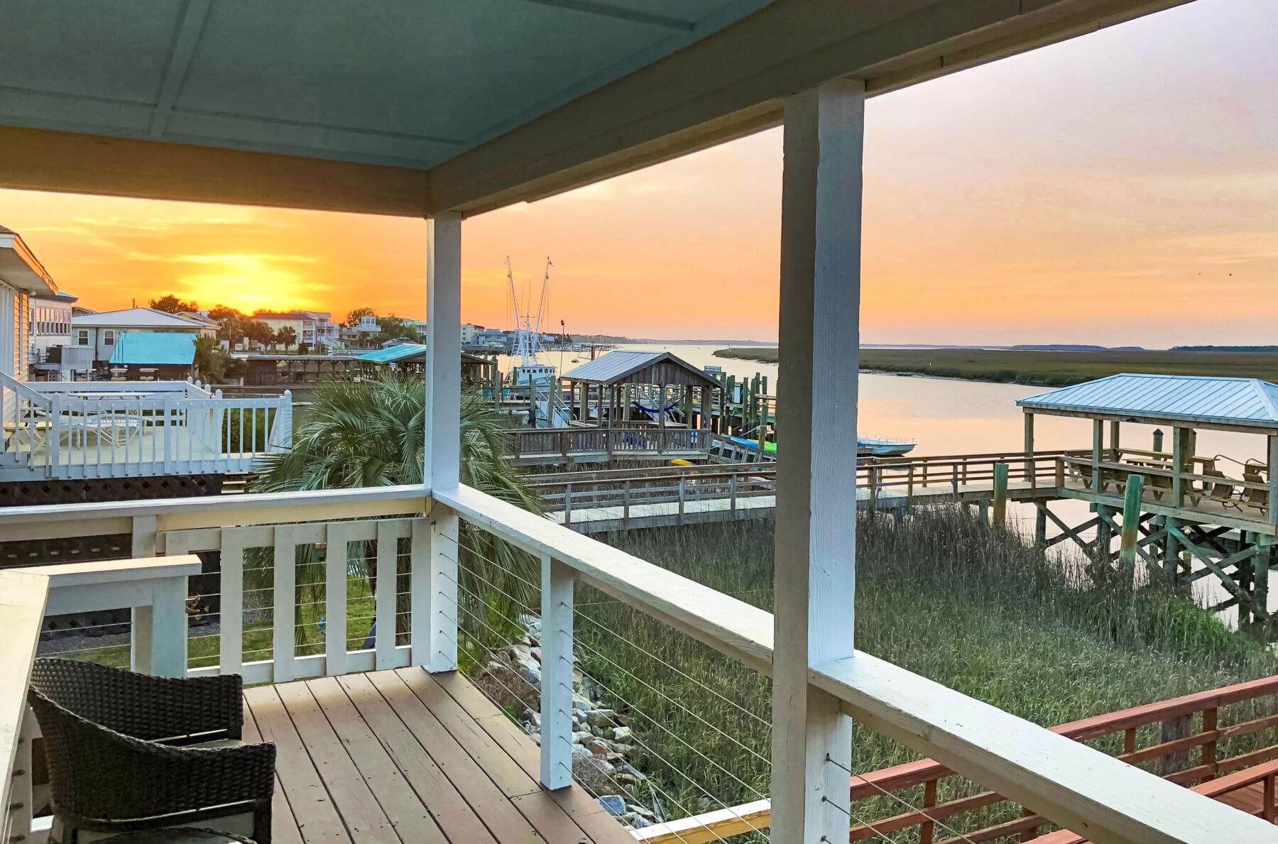 Overlooking southern wetlands and elevated docks, this cozy, covered deck offers a convenient spot to sit back, relax, and appreciate the vibrant surroundings. Cable infill keeps the view through the protective railing as open as possible for effortless enjoyment, any time of day.