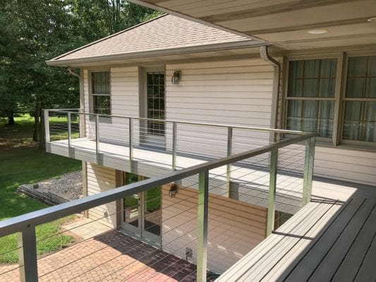 An exterior second floor walkway lies bathing in the sun, the cable infill of the railing hiding in its own shadow, while cozy benches rest before a forested backyard. Truly a picturesque scene, now easily enjoyable from any floor.