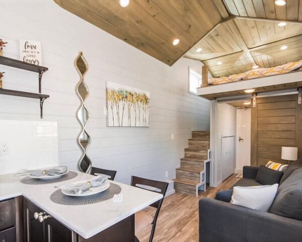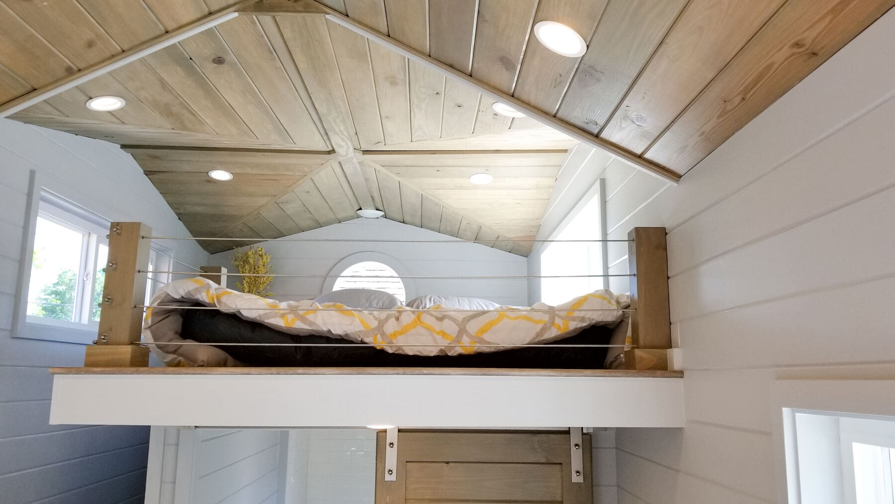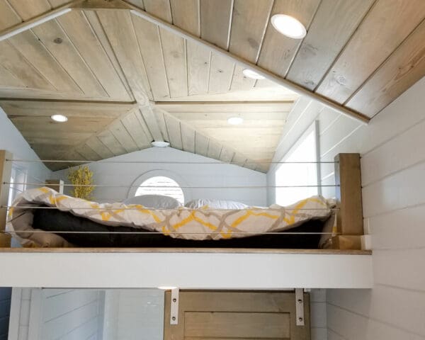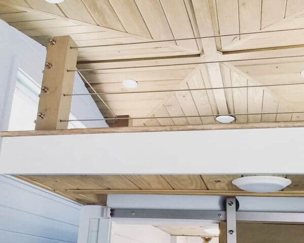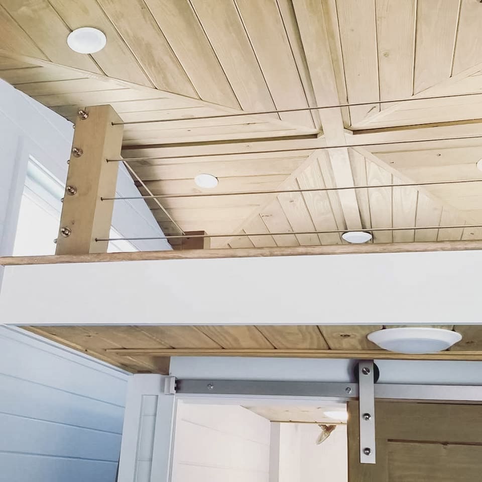 Exuding sophistication and simplicity, this micro home in Longwood, FL features a small loft area for the bed. Not wanting the sleeping area to feel too closed off from the rest of the space, the designers used thick wood posts with reinforced mounting frames and our stainless steel cables and fittings to create a guardrail that keeps the loft as open as possible.