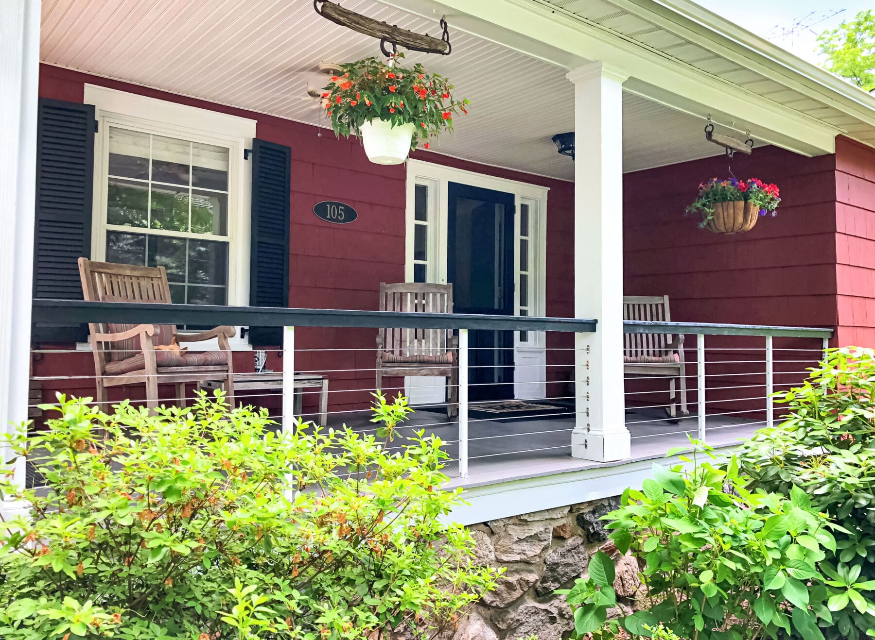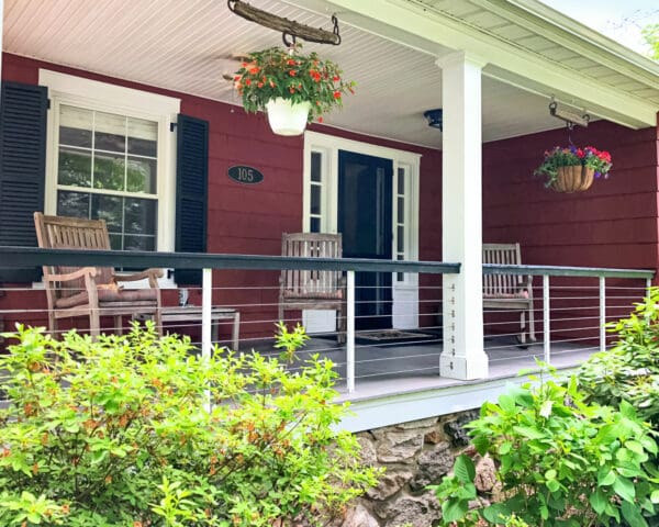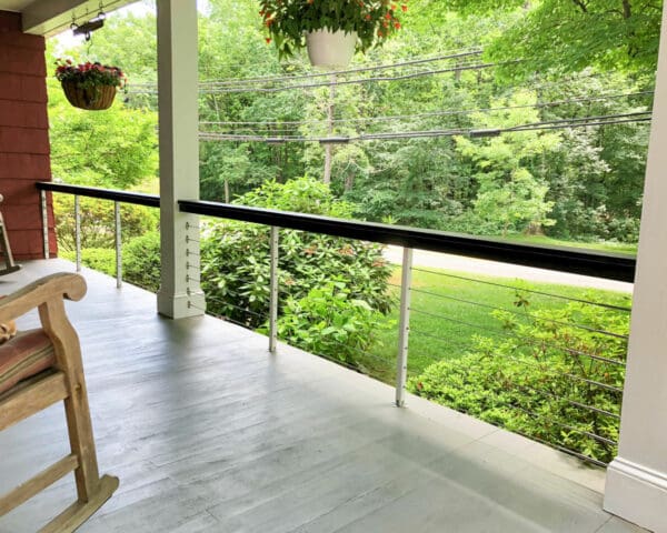 Cable infill offers protection for this striking porch in Pleasantville, NY without closing it off from the road and surrounding greenery. The end result creates an inviting atmosphere.