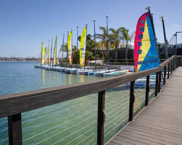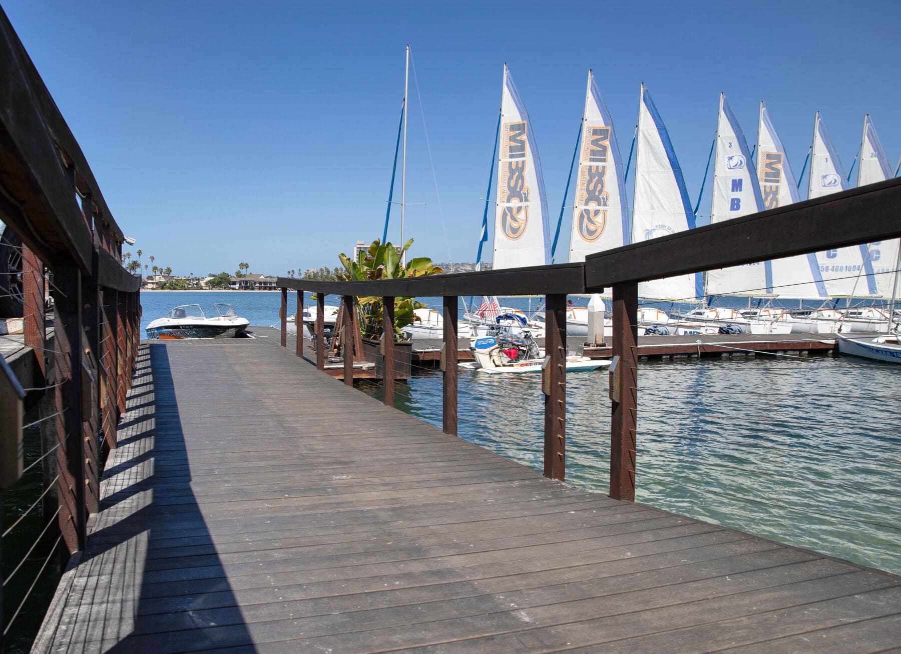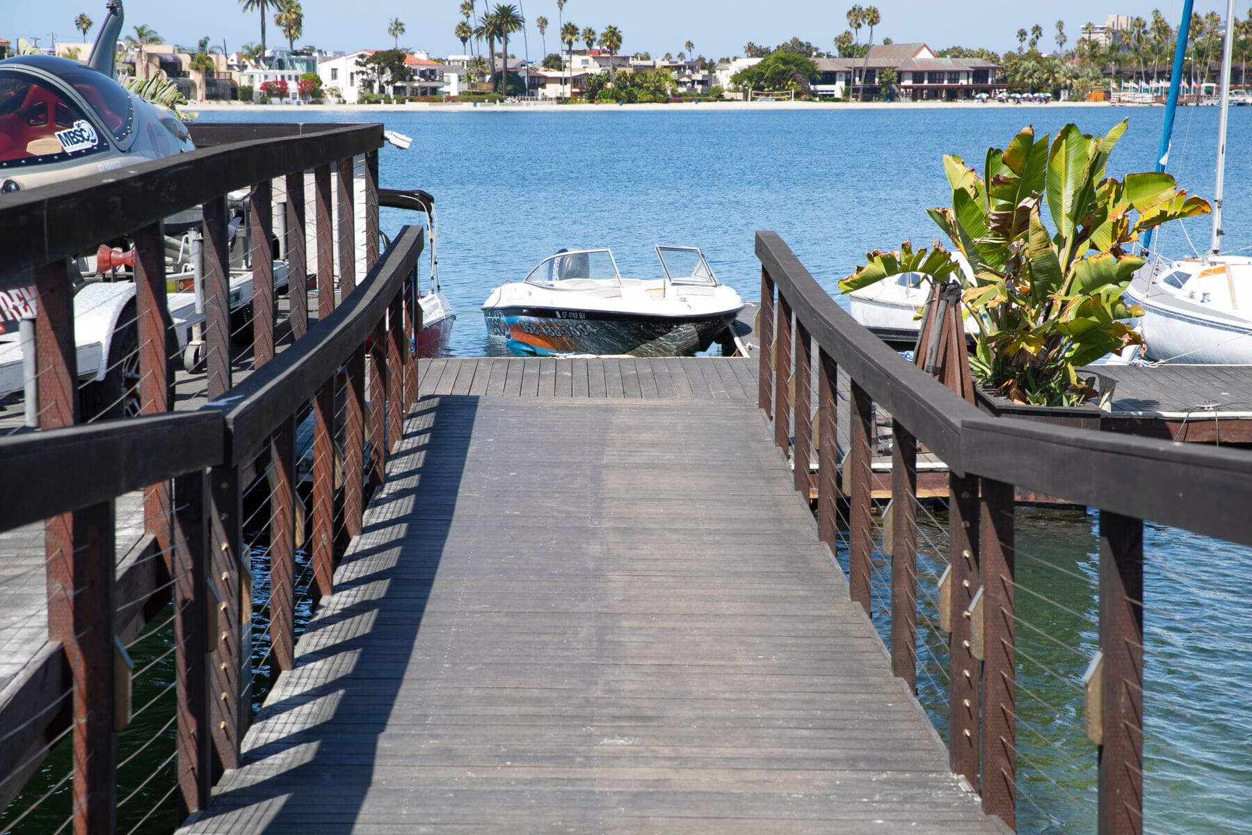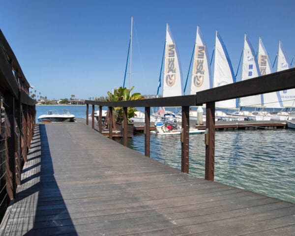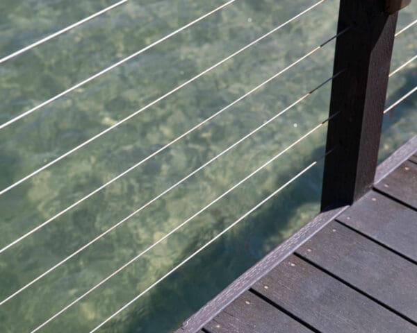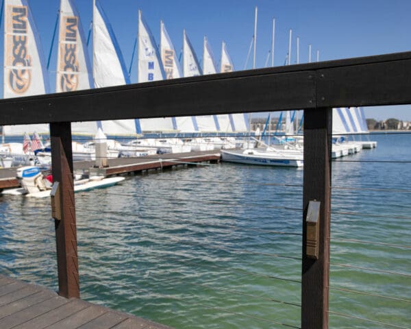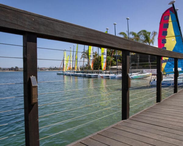 Cable infill adds a level of class and openness to this rustic marina walkway and dock in Mission Bay, San Diego, CA.