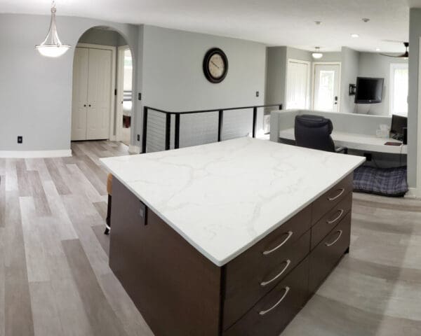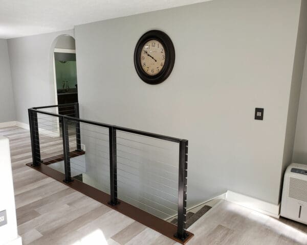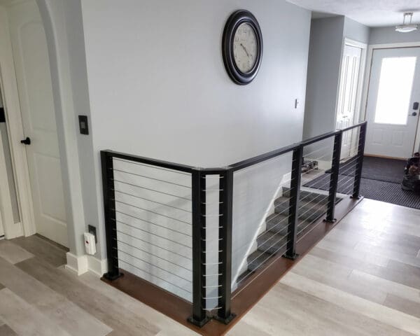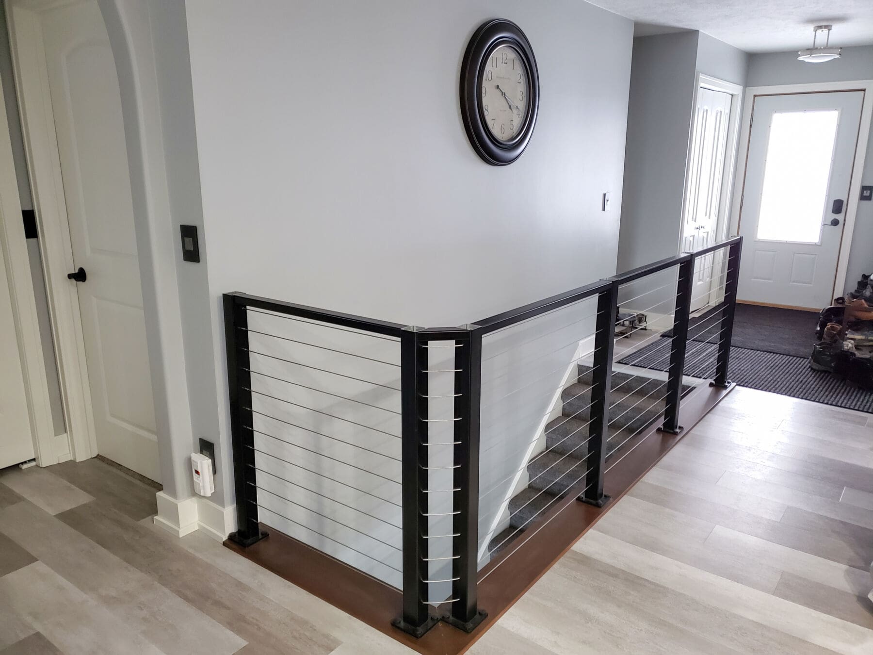 Neutral, soft colors run the show inside this house, making our black cable railing a stunning centerpiece. The open frame draws the eye without blocking the view, all the while silently protecting residents and guests from stairs leading to the floor below.