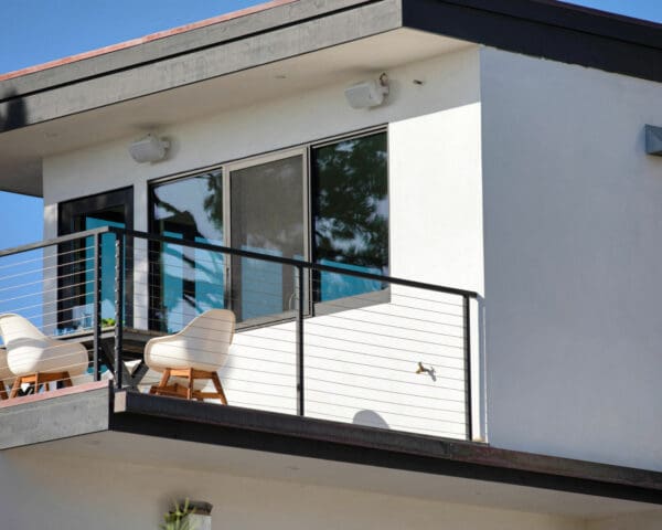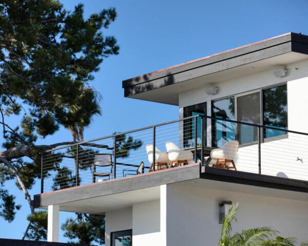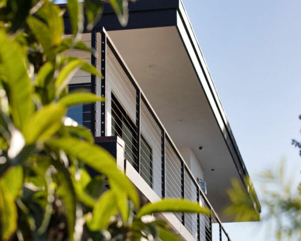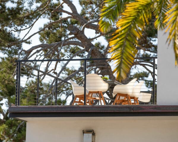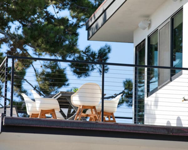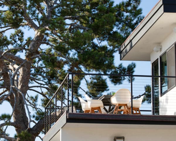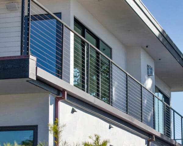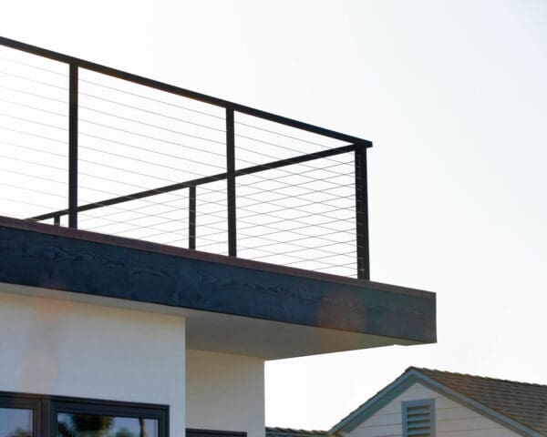 Stainless steel cable and fittings fill in this thin, welded metal railing frame, adding safety without obstructing the view from a wrapping second-story deck.