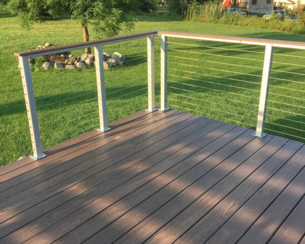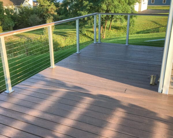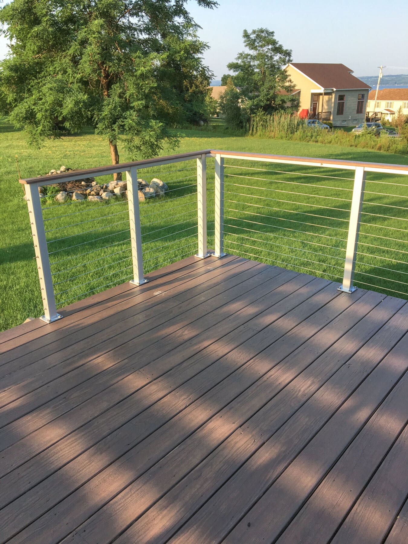 This customer wanted a clean and simple solution for their backyard deck that didn't block their view of nearby Lake Seneca. The combination of wood with natural aluminum cable railing creates a look that's open and contemporary, but also natural and inviting.