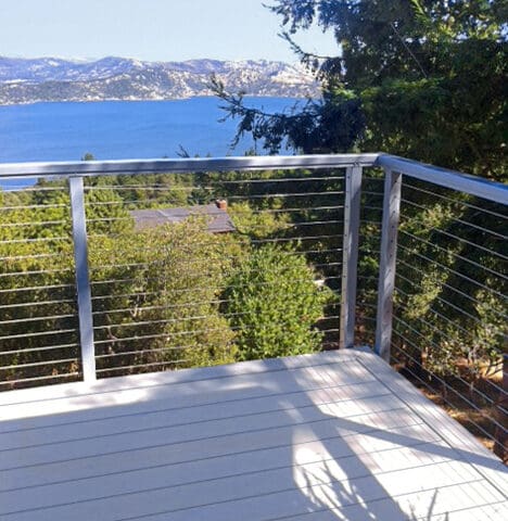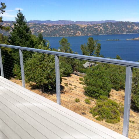 With a stunning panorama of a nearby lake, this deck in Kelseyville, CA needed an open railing that would enhance the view, rather than block it. Our natural aluminum frame matches the deck nicely, while our cable infill disappears against the backdrop.