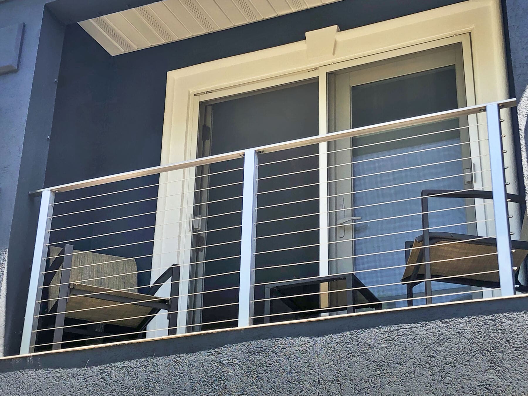 With a small balcony overlooking the front yard and a regal exterior of bold shapes and colors, this home needed a railing that was safe, yet subtle. Our stainless steel square cable railing is the perfect fit, as it complements the rectangular shape of the house while reflecting the colors around it.