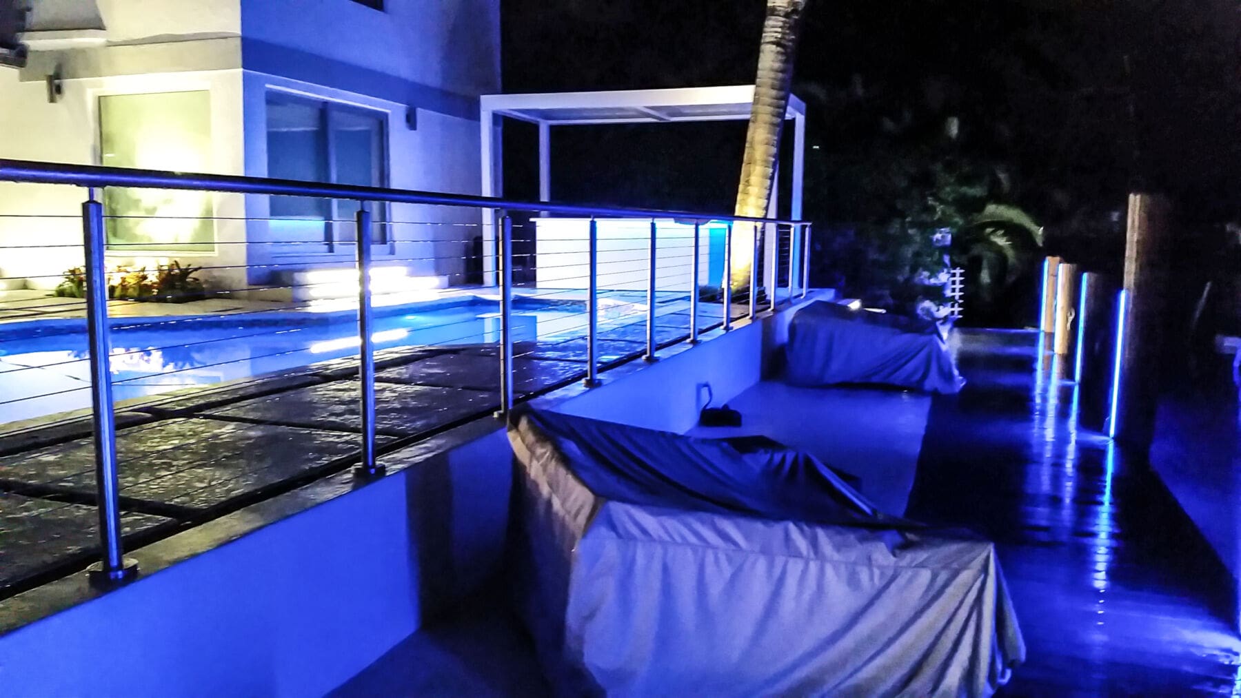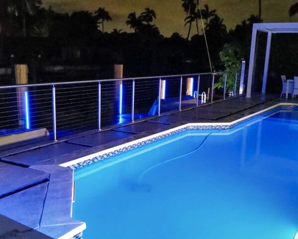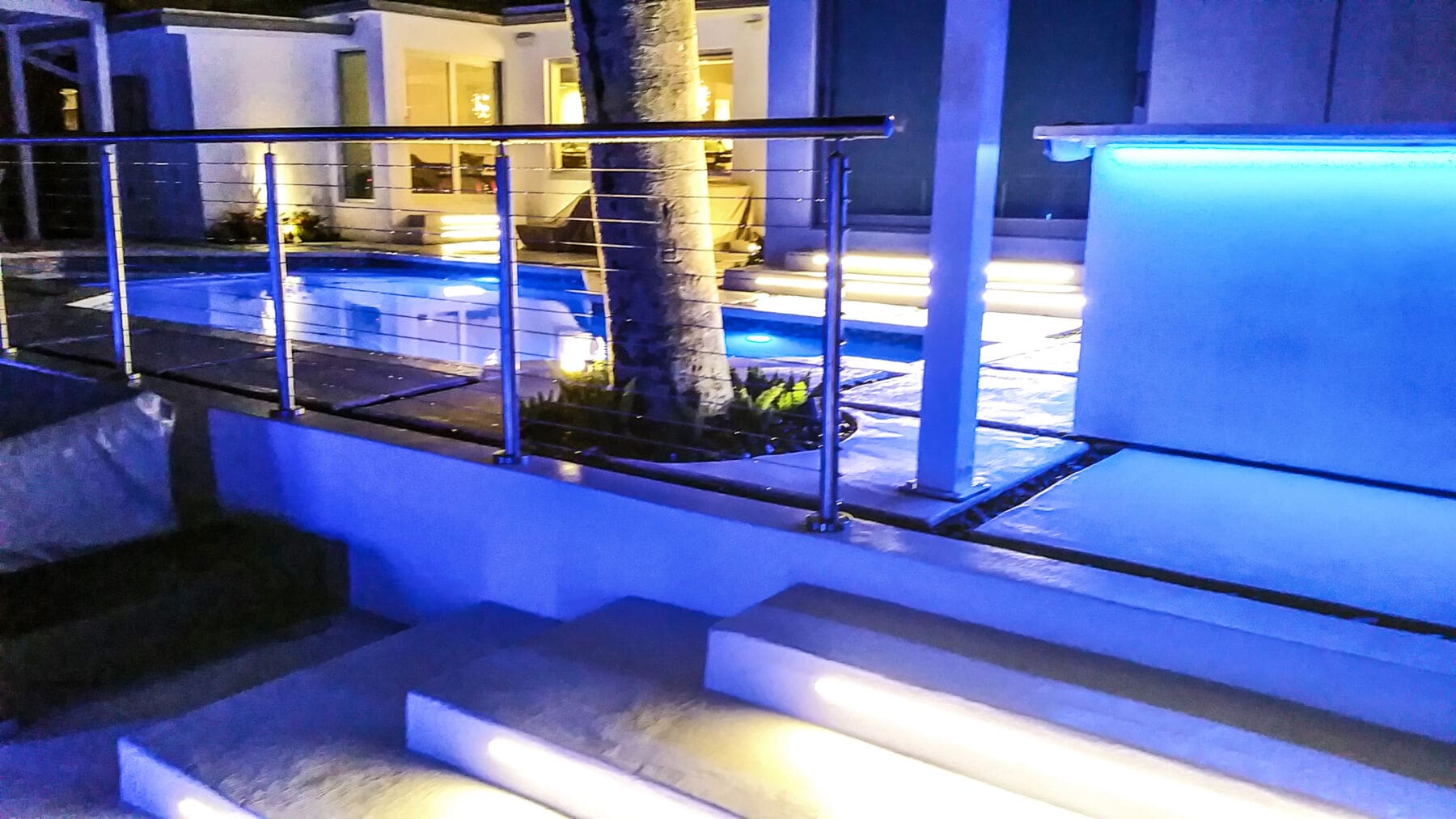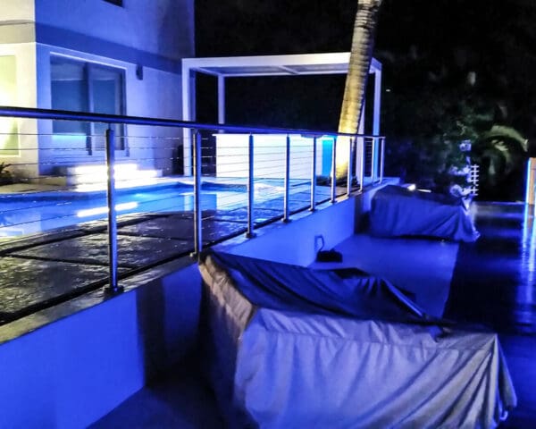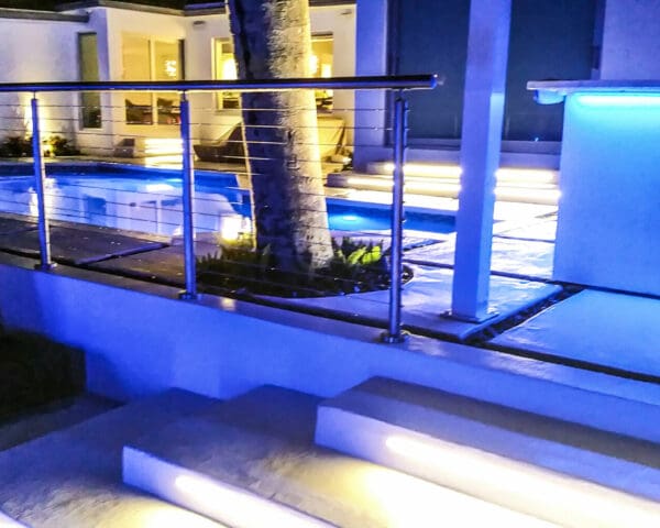 The materials and layout used to create this backyard oasis of contemporary sophistication in Miami, FL is just as luxurious at night as it is during the day. Our stainless round system is the cherry on top, accenting the pool area with polished metal that catches the night lighting perfectly. Marine Grade Stainless Steel also resists corrosion, requiring less maintenance than other materials would in a Floridian environment.