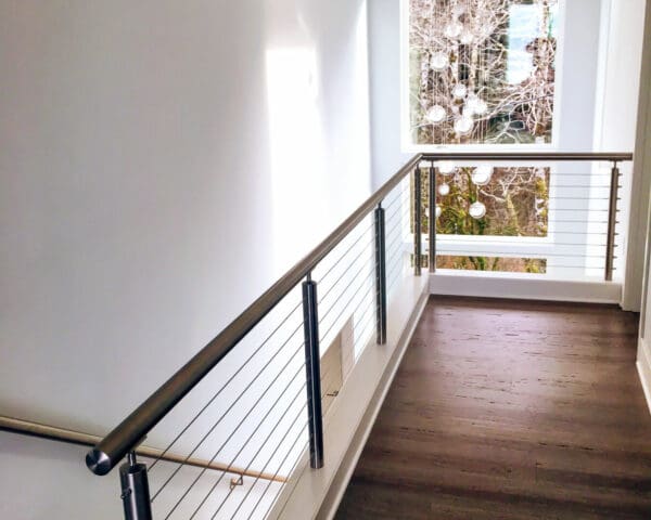 Round stainless steel posts and rails add contemporary polish to this simple walkway and staircase while keeping the narrow area as open as possible.