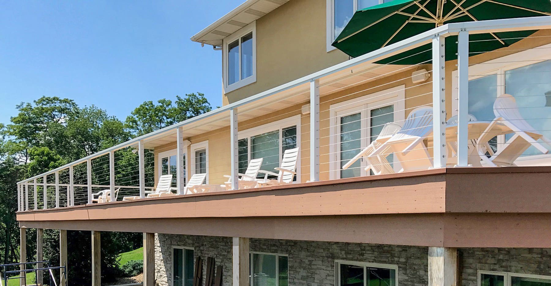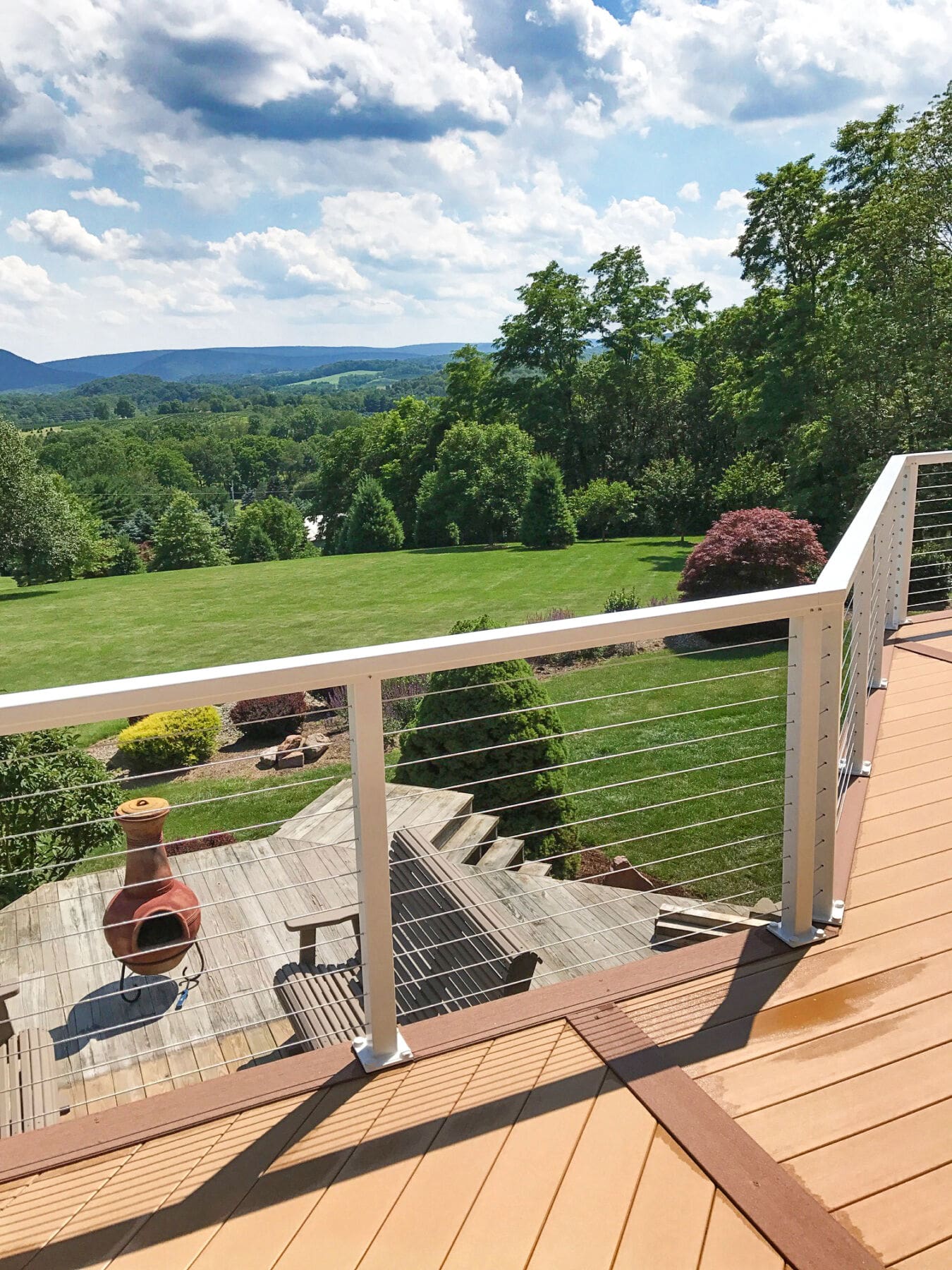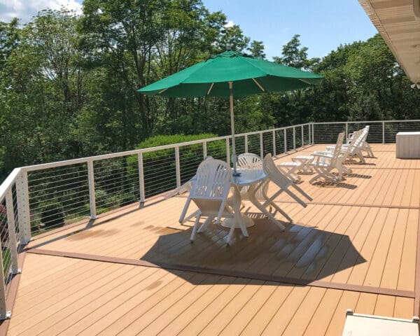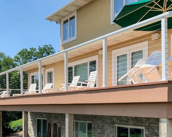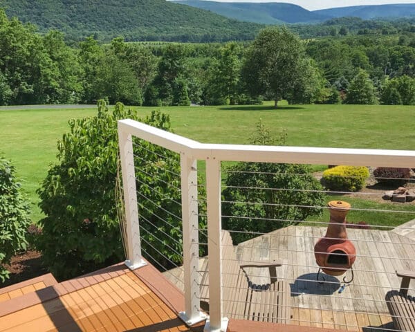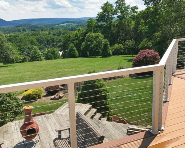 This home in New Ringgold, PA had an extensive, multi-level deck in need of replacing. The upper deck and staircase were redone and completed with a refreshing white aluminum cable railing system. The lower deck was later removed to further open up the backyard and view. Custom corners were a necessity for this particular deck, due to its unique shape.