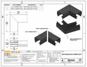 90 DEGREE RECTANGULAR TOP RAIL CORNER connects directly to the cut end of the RECTANGULAR ALUMINUM TOP RAIL and sits on top of the posts. Hardware (316 Stainless Steel) and connecting splice included.