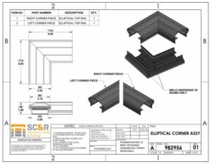 90 DEGREE SHAPED TOP RAIL CORNER connects directly to the cut end of the SHAPED ALUMINUM TOP RAIL and sits on top of the posts. Hardware (316 Stainless Steel) and connecting splice included.